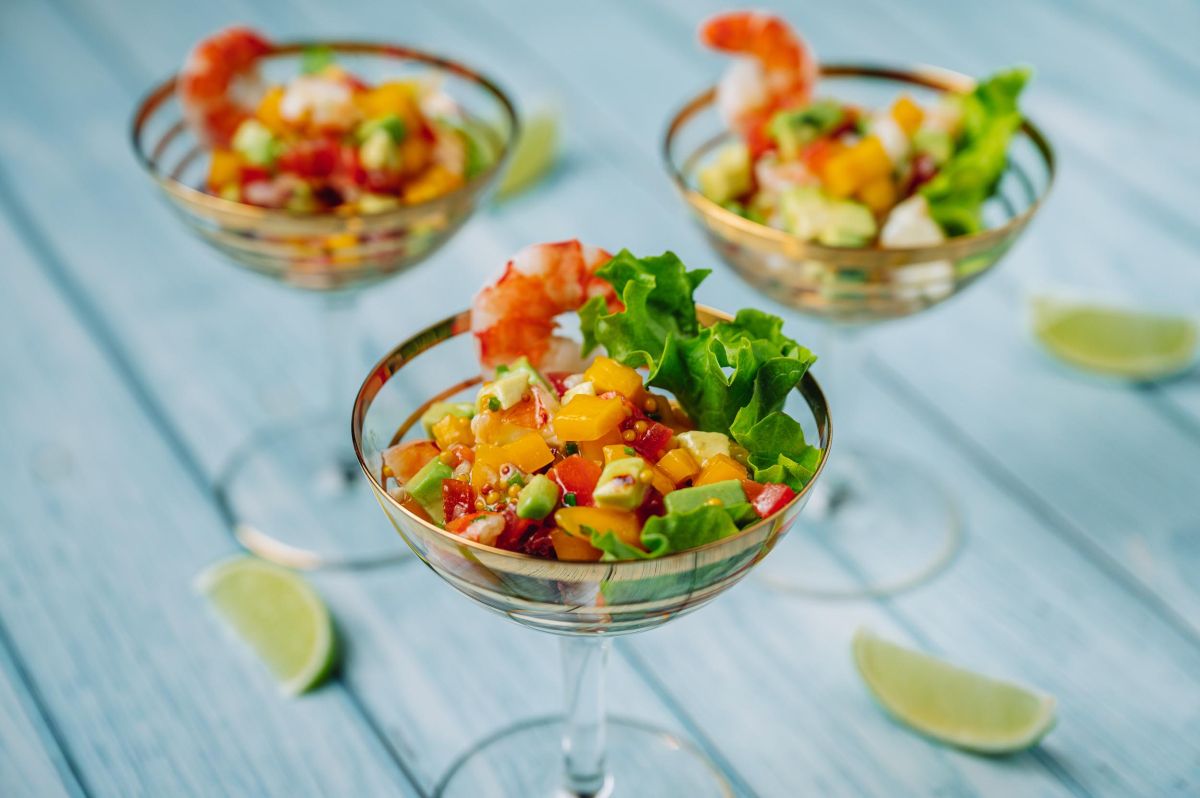 3. Pripravljene kozice damo v skledo ter dodamo narezan mango, avokado, paradižnik in šalotko. Začinimo z gorčičnimi semeni, ingverjem, koriandrom ali peteršiljem, prilijemo limetin sok in olivno olje ter po okusu dodamo čili, sol in poper. Sestavine nežno premešamo, da solata ostane lepa in so posamezni koščki jasno vidni. Najpomembneje je, da izberemo optimalno zrele sadeže – mango, avokado in paradižnik.