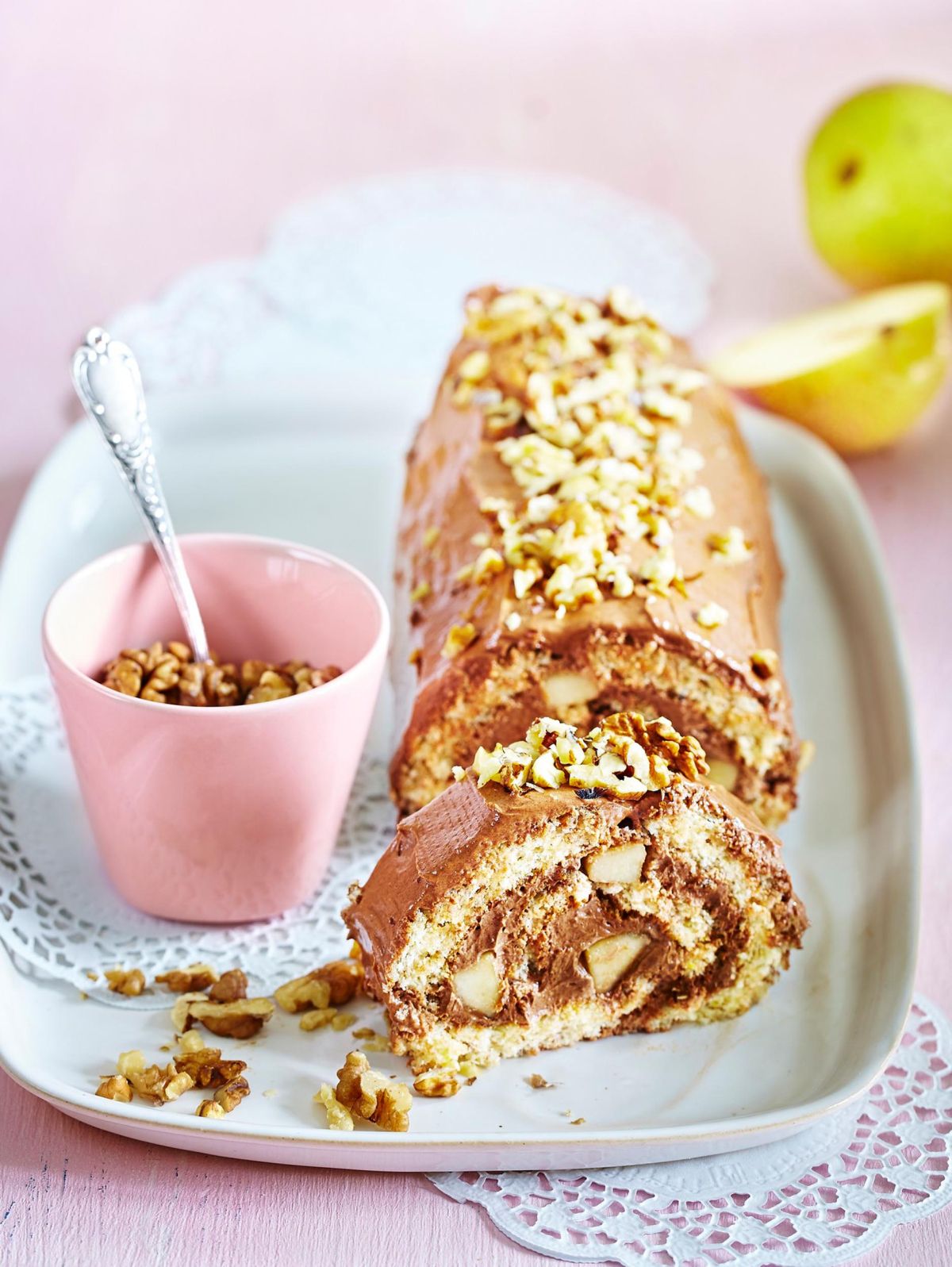 5. Biskvit položite na kuhinjsko krpo. Odstranite papir za peko. Dve tretjini kreme razporedite po biskvitu in jo obložite s hruškami. S pomočjo krpe zavijte. Rulado premažite s preostalo kremo in obložite z nasekljanimi orehi. Postavite na hladno, da se strdi. Pred serviranjem narežite na rezine.