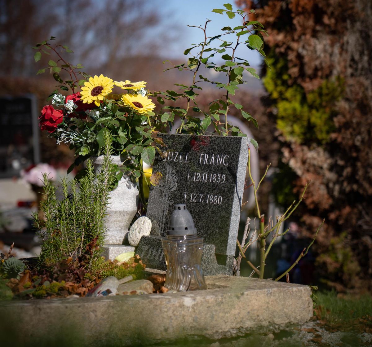 Kako kratko je človeško življenje? Kako dolgo je življenje vrtnice? Človek je velik, močan in glasen, roža pa krhka in brez glasu. Pa vendar je vrtnica vse, kar je ostalo za človekom. Bil je velik, močan in glasen in njegov grob je skromen. Nekaj trdoživih rož še ni povsem predalo svojega zelenja zimskemu mrazu; v vazi je plastičen šopek, poleg majhnega nagrobnika je davno ugasla sveča. Okoli nje so položeni pisani kamenčki, ki so jih očitno poslikale otroške roke, nemara roke učencev in učenk bližnje osnovne šole; naslikale so sveče, križe in rože, rož ni nikoli dovolj. Čeprav je star že več kot 145 let, je grob Franca Guzeja še vedno – živ. Kot je živa legenda o njem. Ob nagrobniku vztraja uborna vrtnica, goli grmič se steguje proti soncu, primrznjenemu na svod.