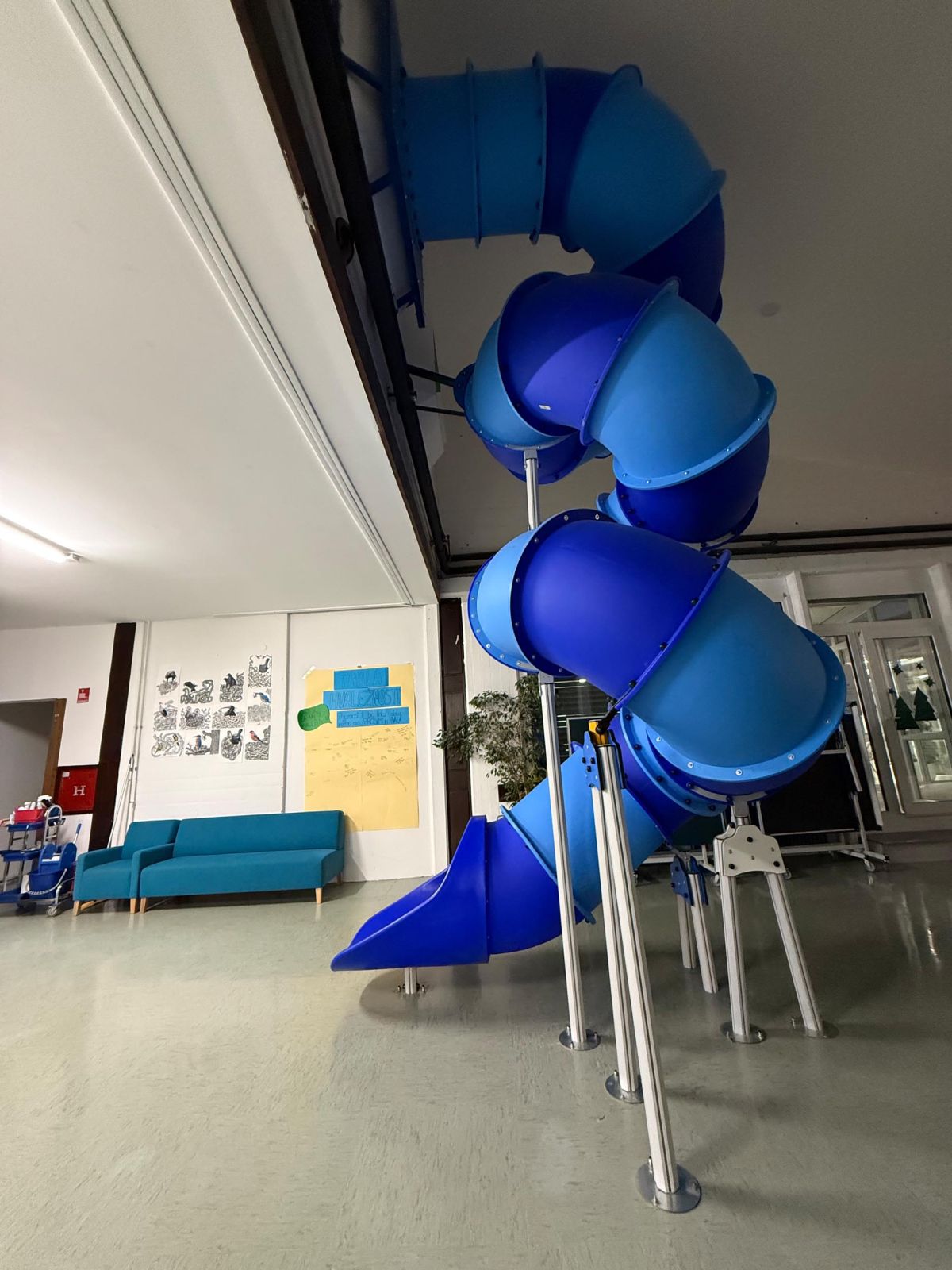 »Ampak jaz sem želel še večjega in hitrejšega!« No, o tem sploh ne dvomimo, sicer pa je že ta modra skulptura pomembno vplivala na ozračje v šoli. Lahko verjamete, da se po toboganu spuščajo tudi učitelji? Menda pa je najbolj navdušena kar ravnateljica, ki je tudi sicer nekaj posebnega. Poleg tega, da so vrata njene pisarne vedno odprta, v njej hraní tudi žoge, zaradi katerih se učenci radi zadržijo pri njej. Ko izvem, da jih brez zadrege brcajo kar po njeni pisarni, jo najbrž pogledam precej začudeno. »Ja, seveda – zakaj pa ne?« se v smehu odzove.