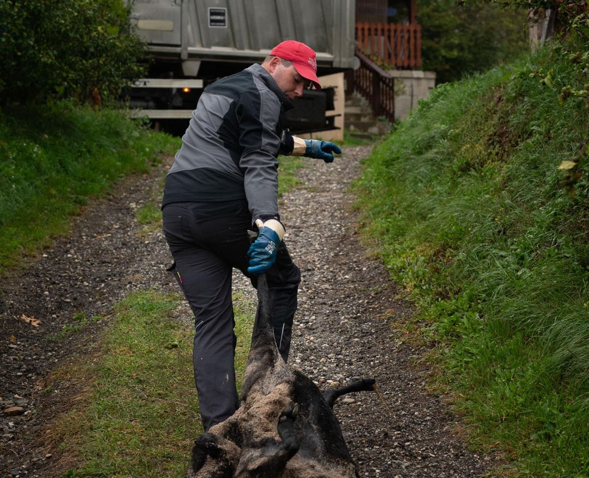 Na poti do naslednje kmetije pobereva še poginulo ovco, ki čaka v prikolici na robu gozda, ob vznožju strme ceste, in Luka jo kar sam, brez pomoči jeklene vrvi, zavihti na vozilo. Nato prispeva na dvorišče domačije, kjer nas pozdravi gospa, ki pokaže, da je treba po ovco nekaj metrov nižje. Luka jo začne vleči po poti do tovornjaka, njegov izraz je nespremenjen, midve s kmetico, ki stojiva kar nekaj metrov stran od kadavra, pa si morava pokriti nos in usta.