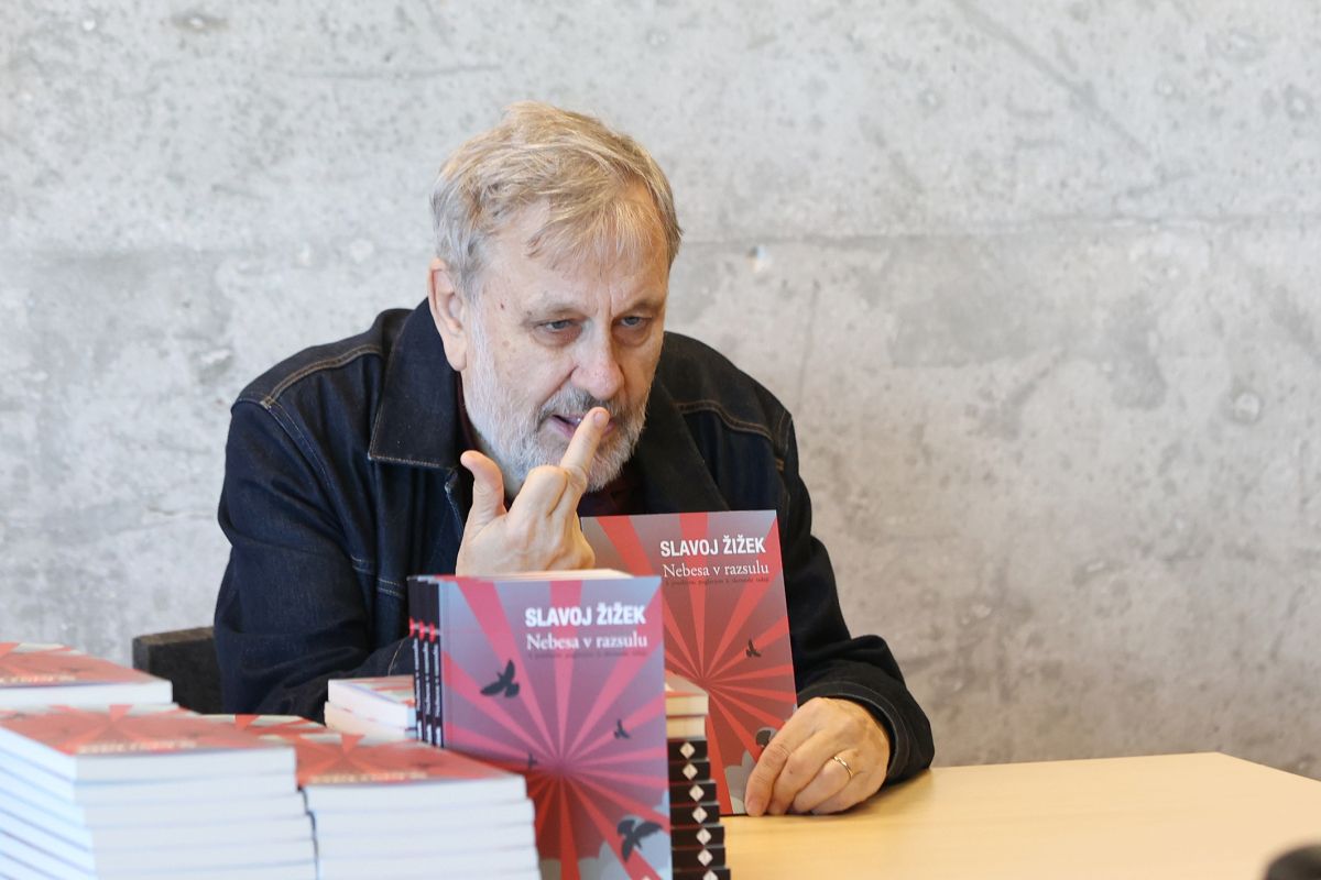 A se me sploh splača prevajati, je zavzdihnil ob podpisovanju knjige Nebesa v razsulu, zbirke njegovih komentarjev iz leta 2021. Bere ga namreč ves svet, ta pa govori pretežno angleško. Ampak Žižek v slovenščini je poslastica in privilegij. Če mislite, da so njegovi komentarji stara jajca, se motite, so bolj preroška napoved. Kaj se bo zgodilo, če ne bomo previdni.