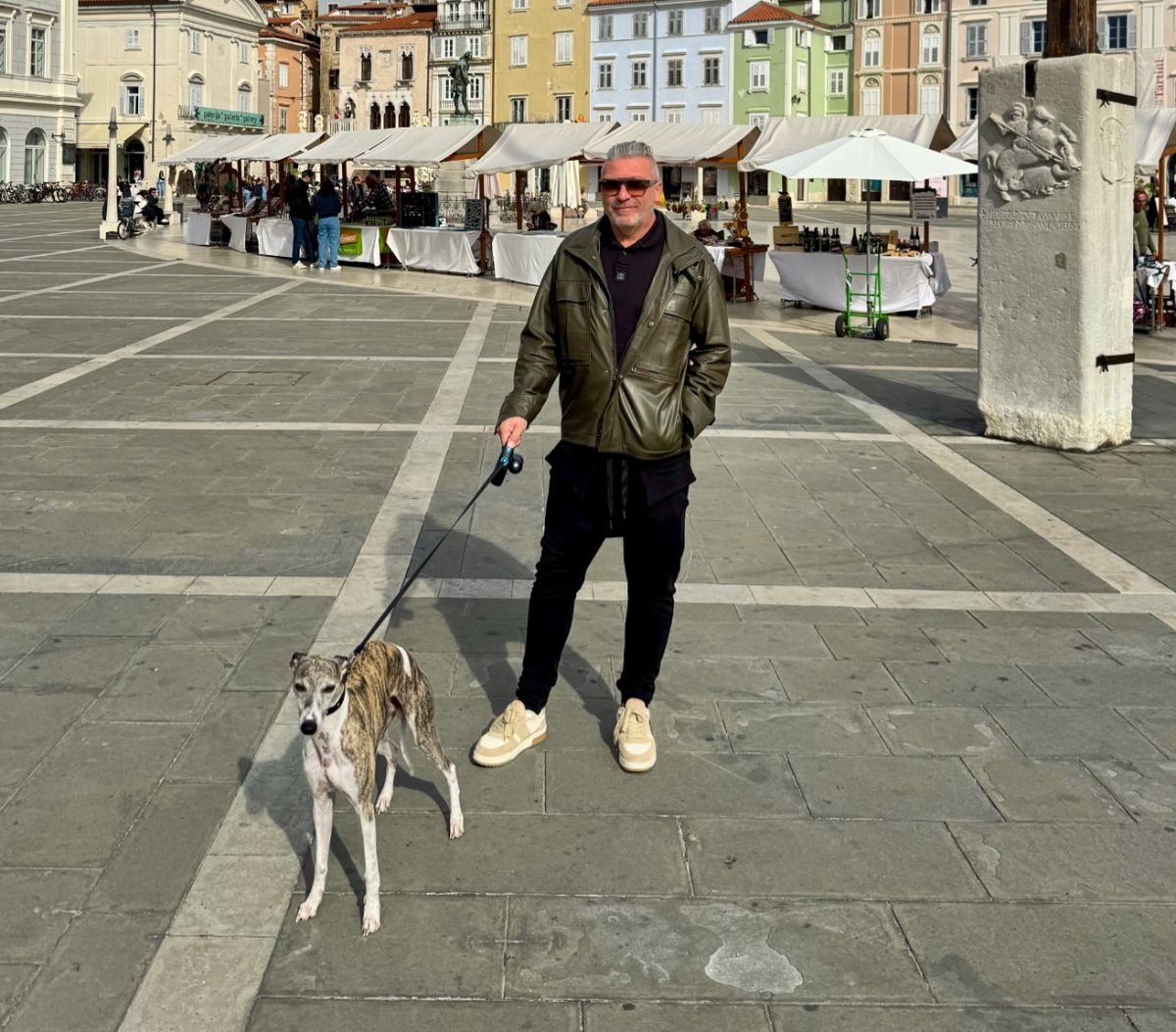 Aleš Uranjek je rad v pasji družbi, med sprehodom po Piranu pa mu največkrat dela družbo angleški hrt z nenavadnim imenom Bejb.