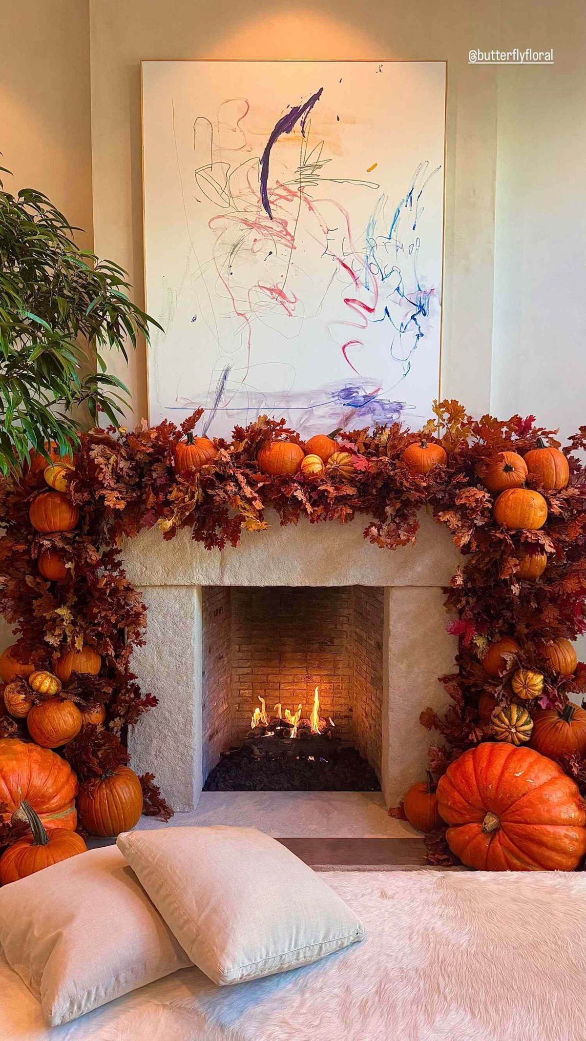 Ob kaminu so razporejene buče, mehke blazine in jesenski aranžmaji, ki jih je ustvarila oblikovalka Inna iz podjetja Butterfly Floral.