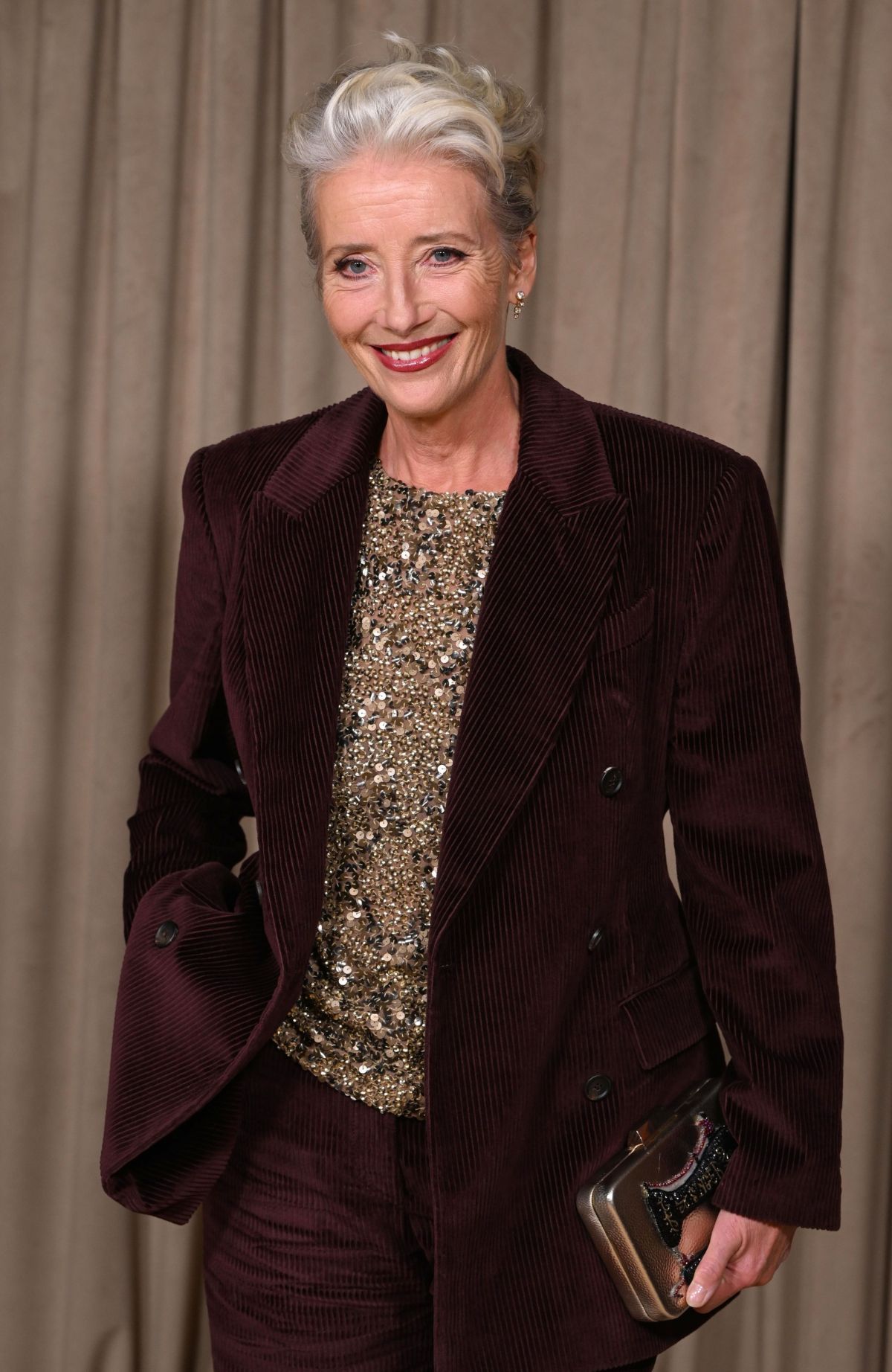 George je nosil temno modro obleko z metuljčkom, Amal pa je blestela v dolgi rjavi obleki Atelier Versace oblikovalca Daria Vitaleja. Njen glamurozen videz pa so dopolnili elegantno valoviti lasje, bleščeči nakit in rjavi salonarji.