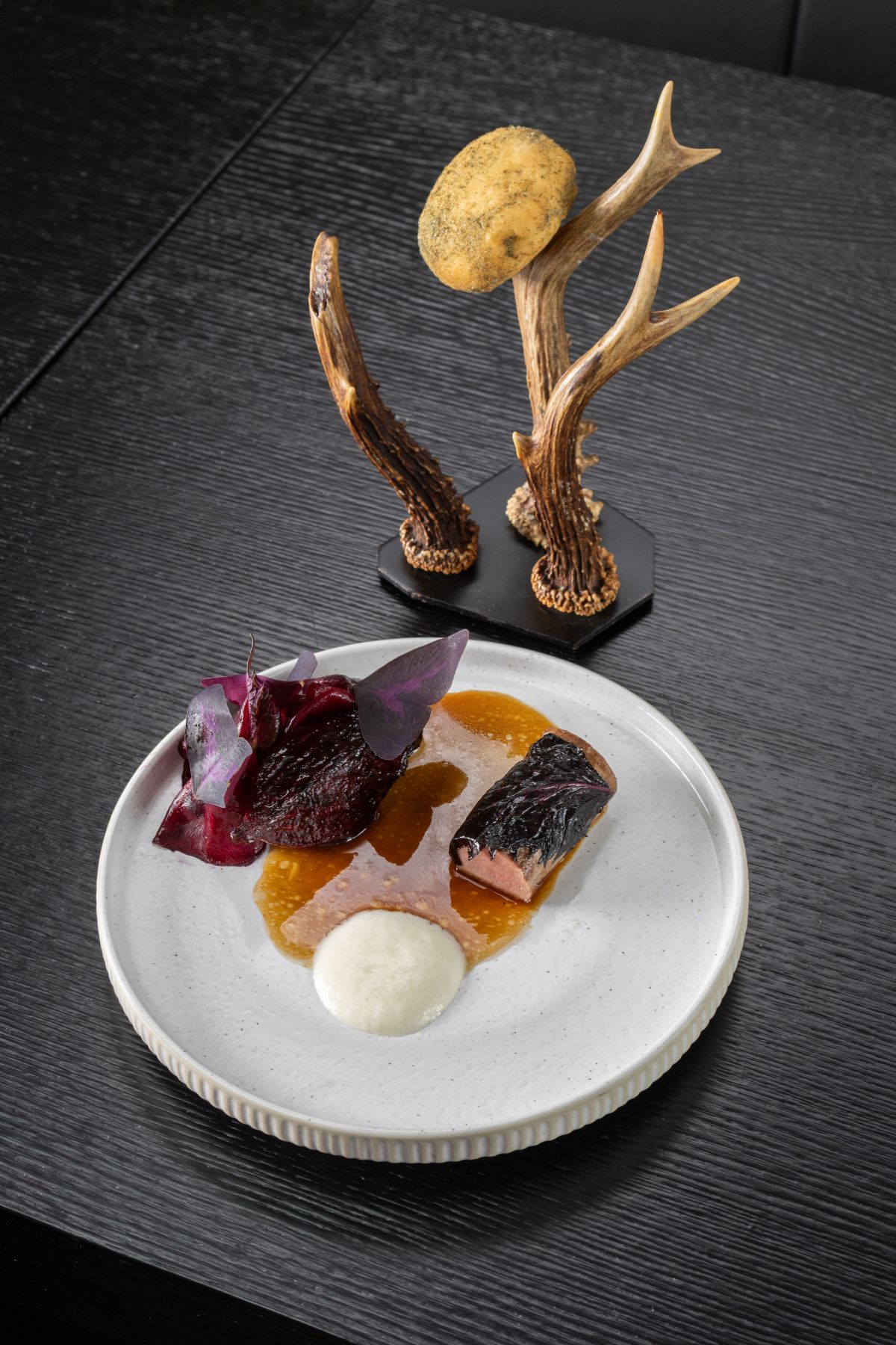 Ena takih reči, ki smo jih okusili, je pasta iz fermentirane in nato pražene zelenjave, ki je zelo močnega okusa z veliko umamija. »Nastala je, ko sta bila september in oktober zelo deževna, nič ni zorelo, pa sem dal nekaj zelenjave, ki ni bila lepa, fermentirati,« skoraj poetično pripoveduje Jakob. In to pasto, ki je primer, kako porabiti tudi »neuspele« pridelke, potem pobereš s krožnika s šopkom zelišč, ki je namesto rogov zataknjen na odlitek srnjakove glave. »Ta kalup sem naredil sam in zdaj služi kot krožnik prav posebne oblike. Tudi prvi hod – pinjenec – se popije iz roga, ki sem izdelal sam. Vse to je skladno s trajnostno filozofijo, ki ji želimo slediti z našo kulinariko,« razlaga chef.