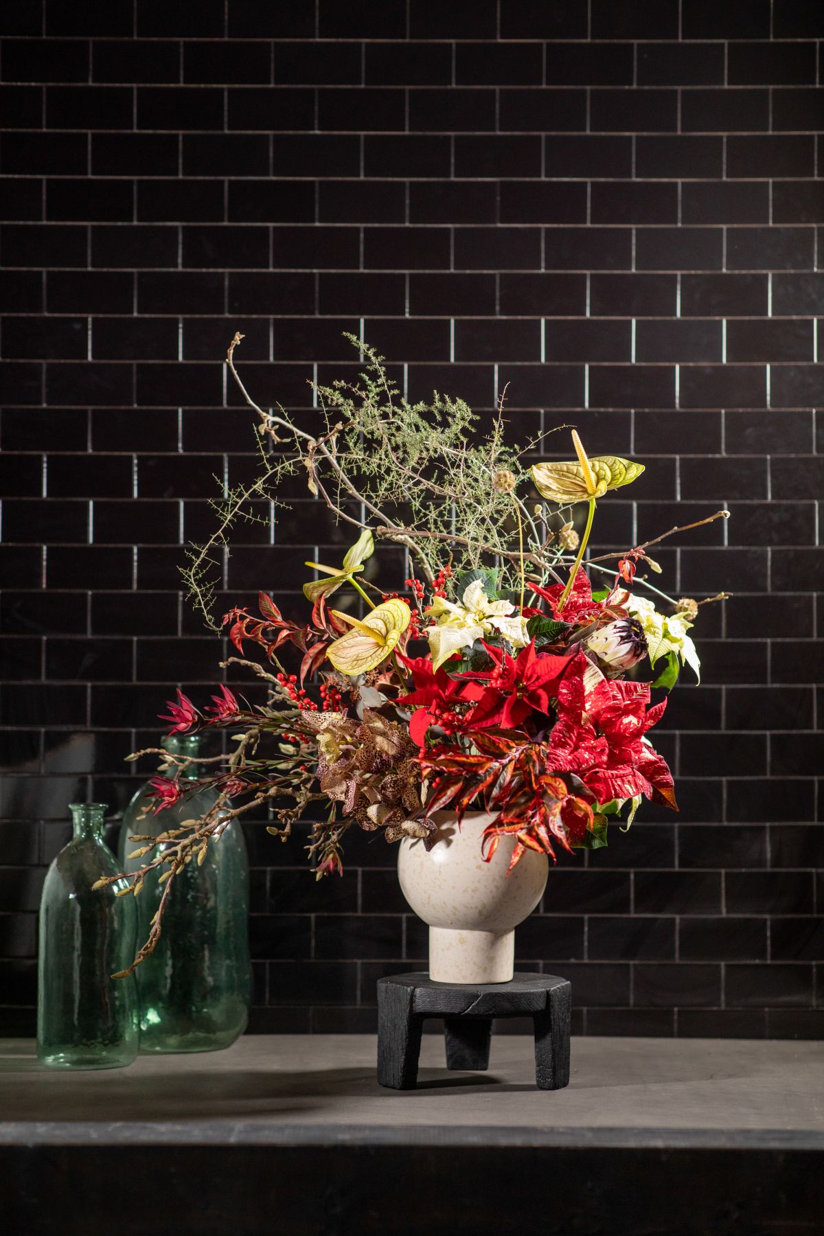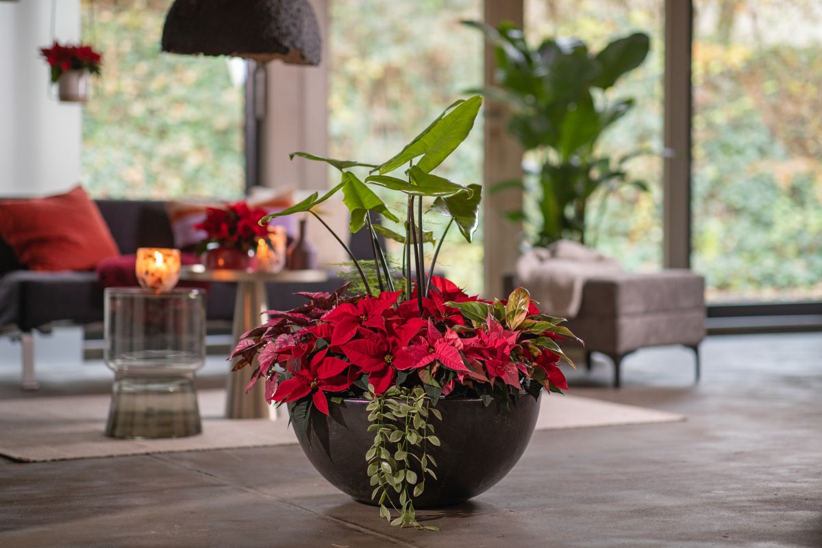 Na gosto zasejana skleda, postavljena na tla sredi sobe, je fantastična osrednja točka. Za ta sodobni aranžma so rdeče božične zvezde kombinirali s slonovim ušesom (Alocasia zebrina), okrasnimi šparglji (Asparagus plumosus), begonijami z barvnimi listi (Begonia rex 'Indian Summer'), ogrlico (Dischidia nummularia) in filodendronom 'Prince of Orange'.