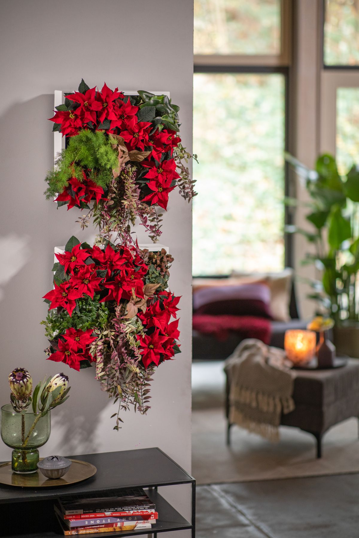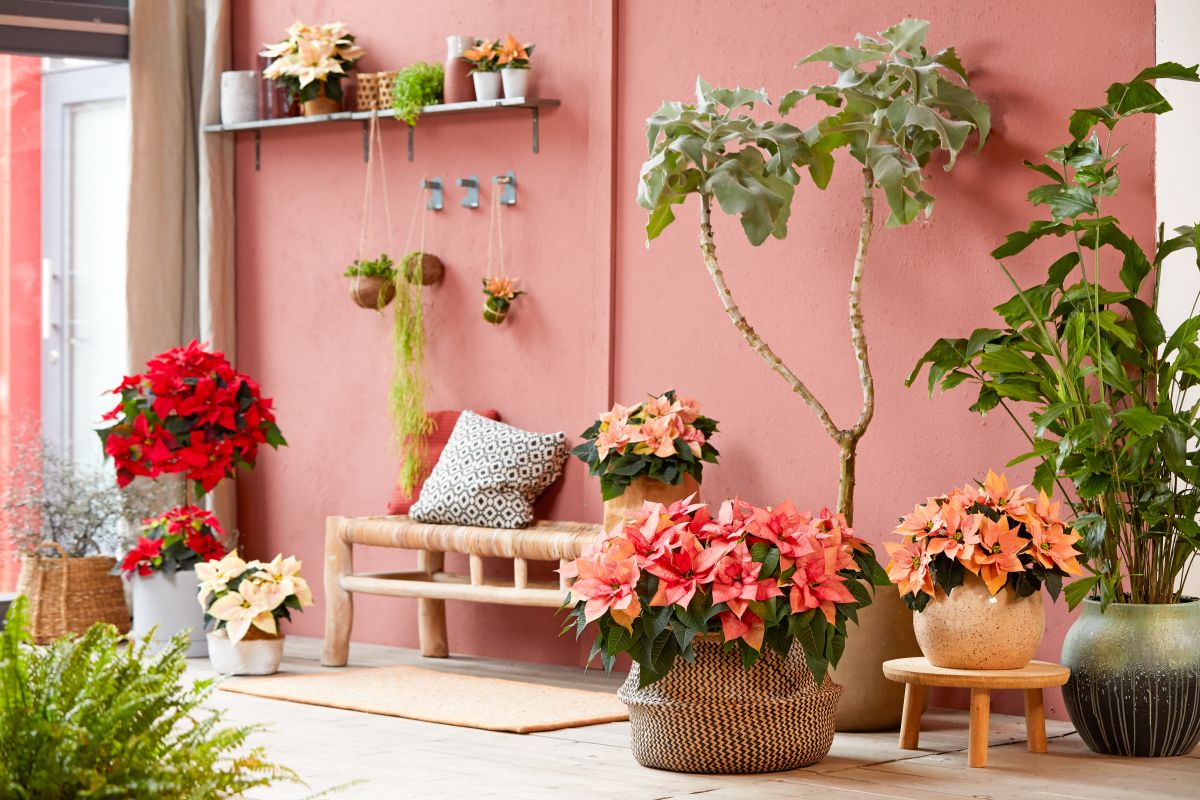 Sodobno življenje z božičnimi zvezdami in listnatimi rastlinami