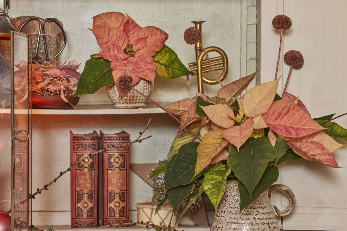 Marelične božične zvezde tvorijo okrasno tihožitje s starinskimi knjigami in vintage dodatki. Pomembno: da bi božične zvezde uspevale, potrebujejo svetlo, toplo mesto, zaščiteno pred prepihom. Če so vaše rastline na napačnem mestu, se bodo odzvale tako, da jim bo odpadlo listje.