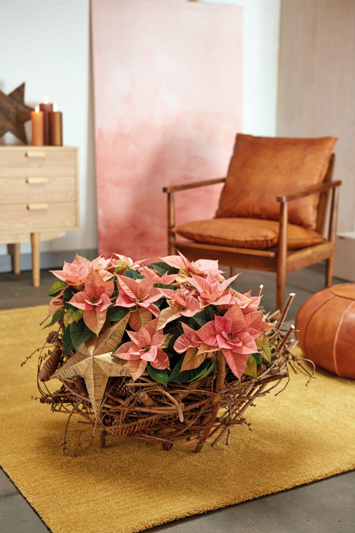 Mini božične zvezde v rožnati in krem barvi so videti osupljivo v pleteni košarici. Namig: da bi preprečili iztekanje vode ali prekomerno namakanje rastlin, obložite notranjost košarice z nepremočljivo folijo in rastline zalivajte v majhnih količinah.
