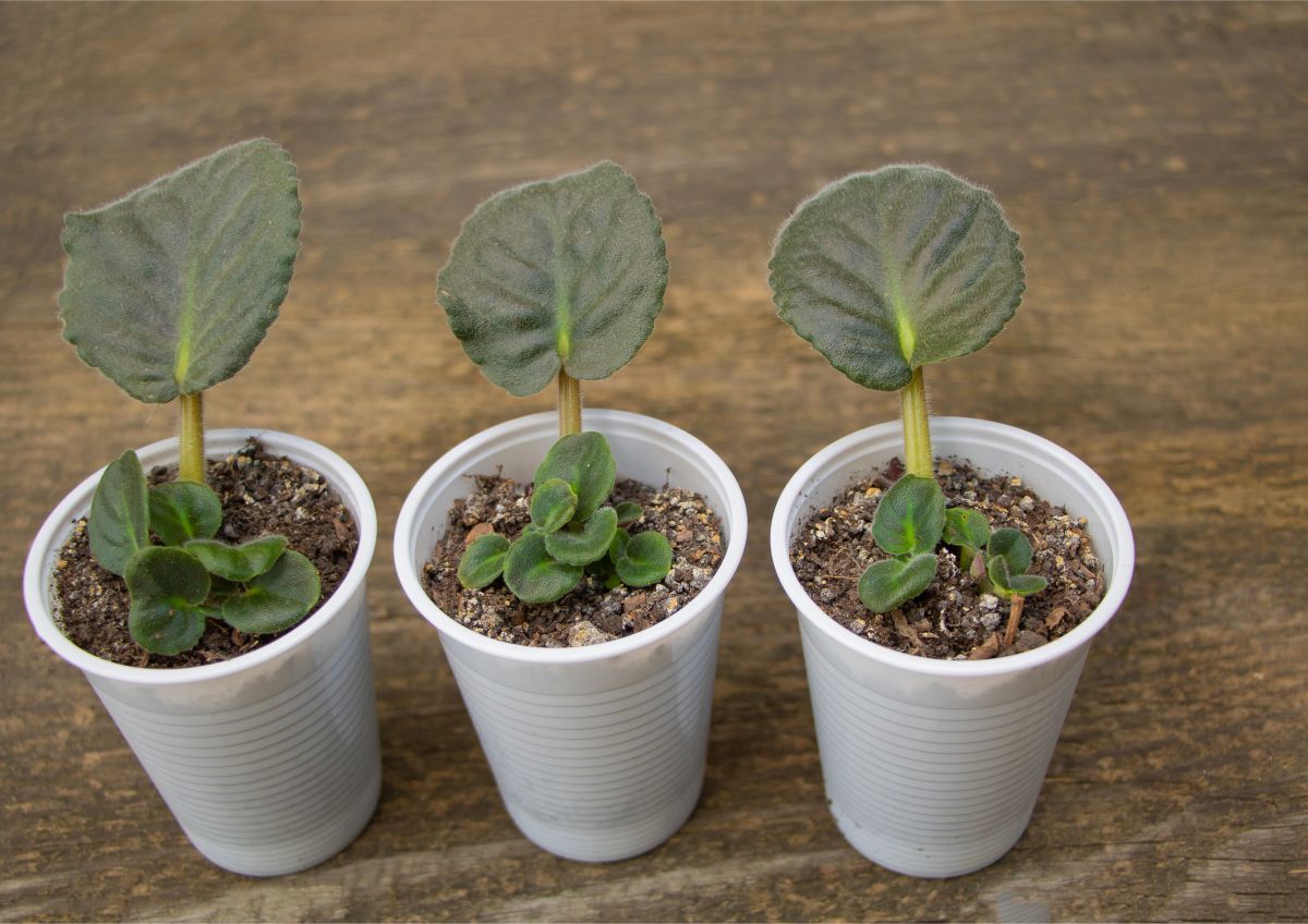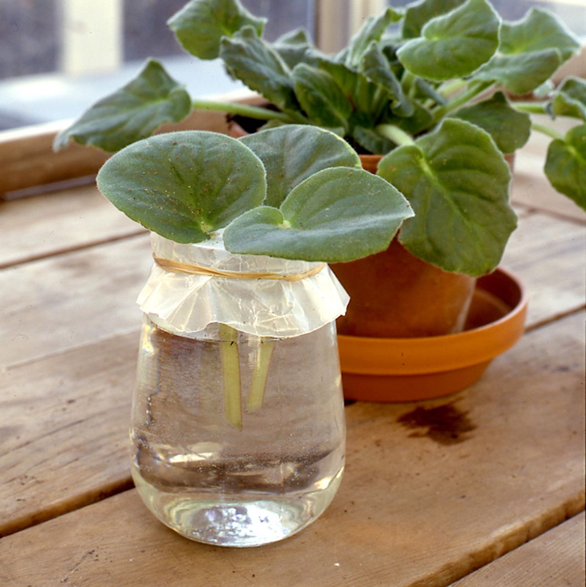 Rastlini odrežemo list, mu z ostrim nožem skrajšamo pecelj na dolžino 4–5 cm, ga damo v vodo in čakamo, da poženejo korenine. Če imamo rastlino z majhnimi listi, ki lahko padejo v vodo, si lahko pomagamo s plastično folijo, ki jo napnemo čez posodo z vodo.