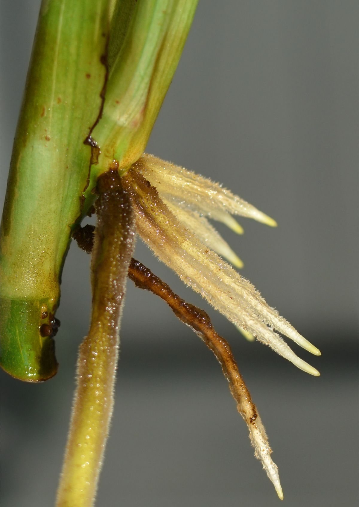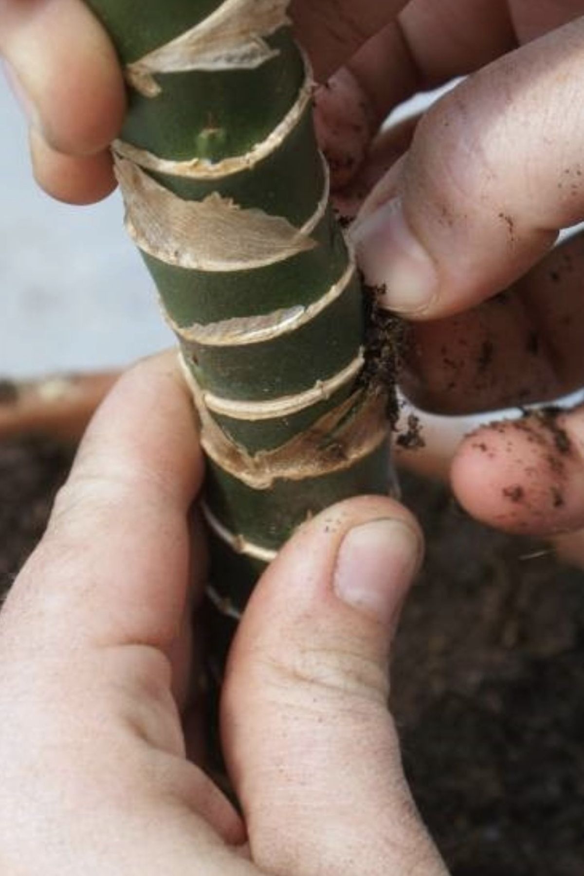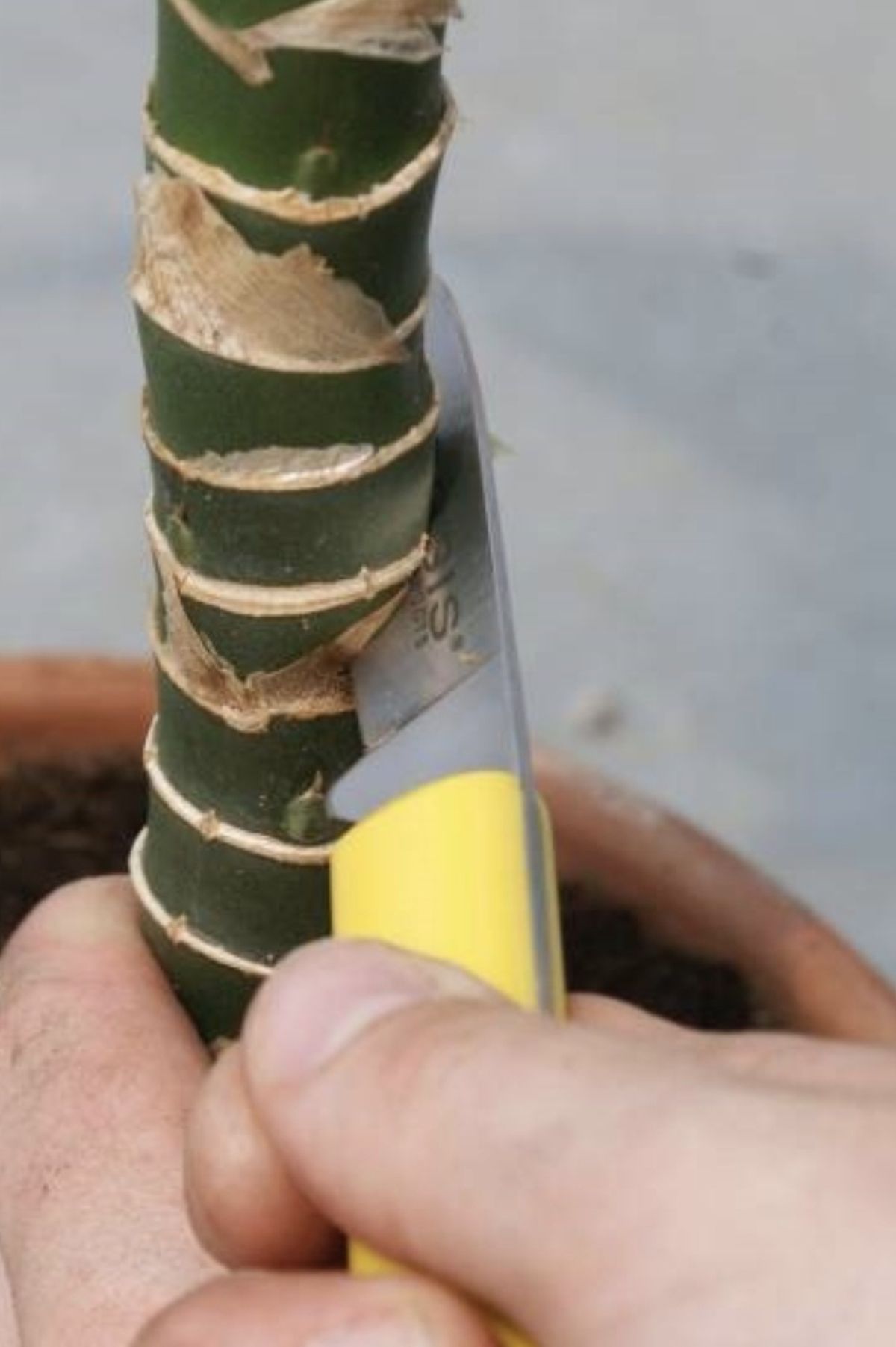 Z ostrim razkuženim nožem poševno zarežemo v steblo. Pri tem pazimo, da stebla ne prerežemo.