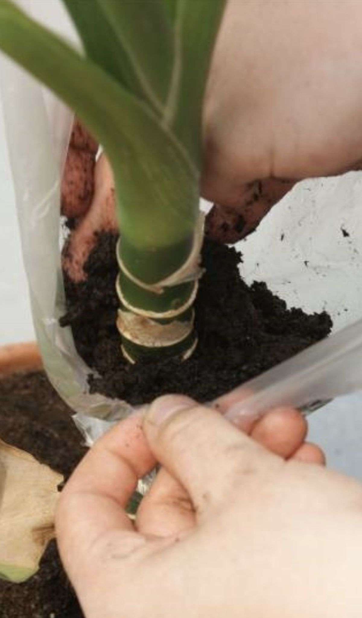 Folija mora biti prozorna zato, da vidimo, kdaj korenine prepletejo substrat in zgornji del rastline lahko odrežemo ter posadimo v nov lonček.