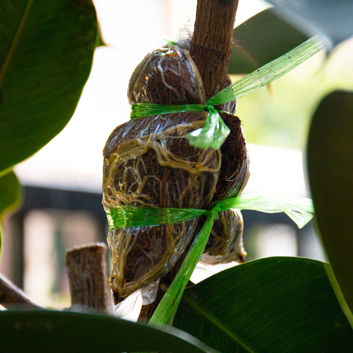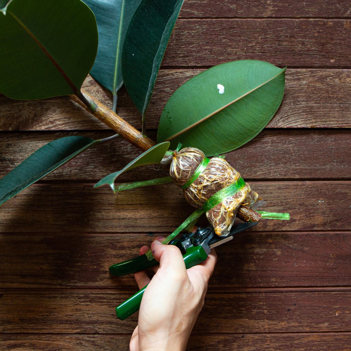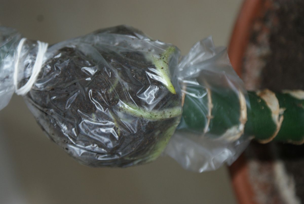 Ranjeno mesto lahko tudi namažemo s hormonskim preparatom za ukoreninjenje, tako korenine hitreje poženejo. Pod rano pritrdimo prozorno folijo tako, da jo ovijemo okoli stebla in jo zavežemo z elastiko.