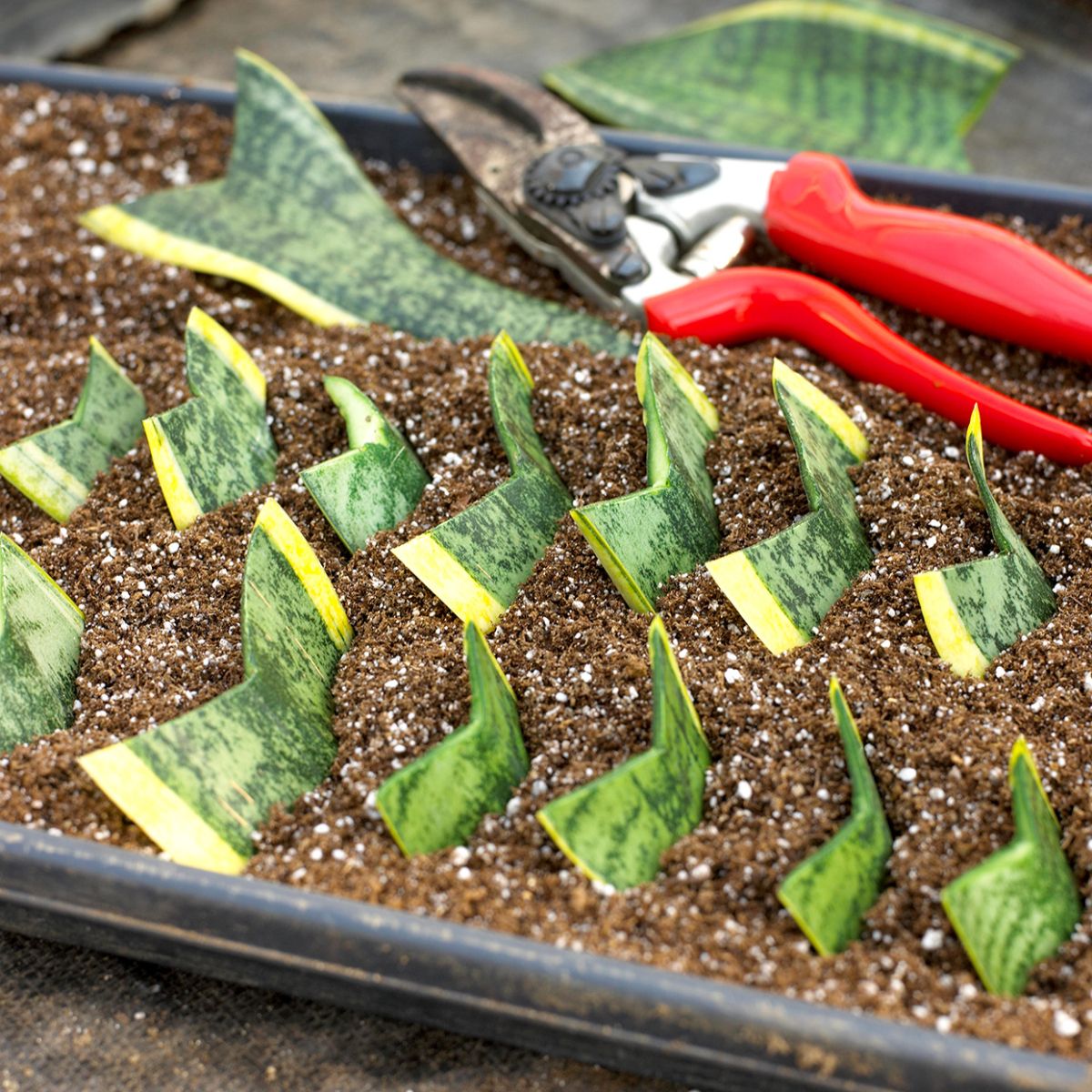 Matično rastlino vzamemo iz lonca in izberemo zdrav list. Odrežemo ga pri osnovi. Z ostrim nožem razrežemo list prečno, v 5–8 cm dolge koščke. Iz vsakega odrezka lahko pridobimo novo rastlino. Več listnih koščkov posadimo v substrat, ne povsem navpično. Nove korenine nastanejo le na pokriti rezni ploskvi. Ko se razvijejo nove rastline, jih posadimo v lastne lonce.