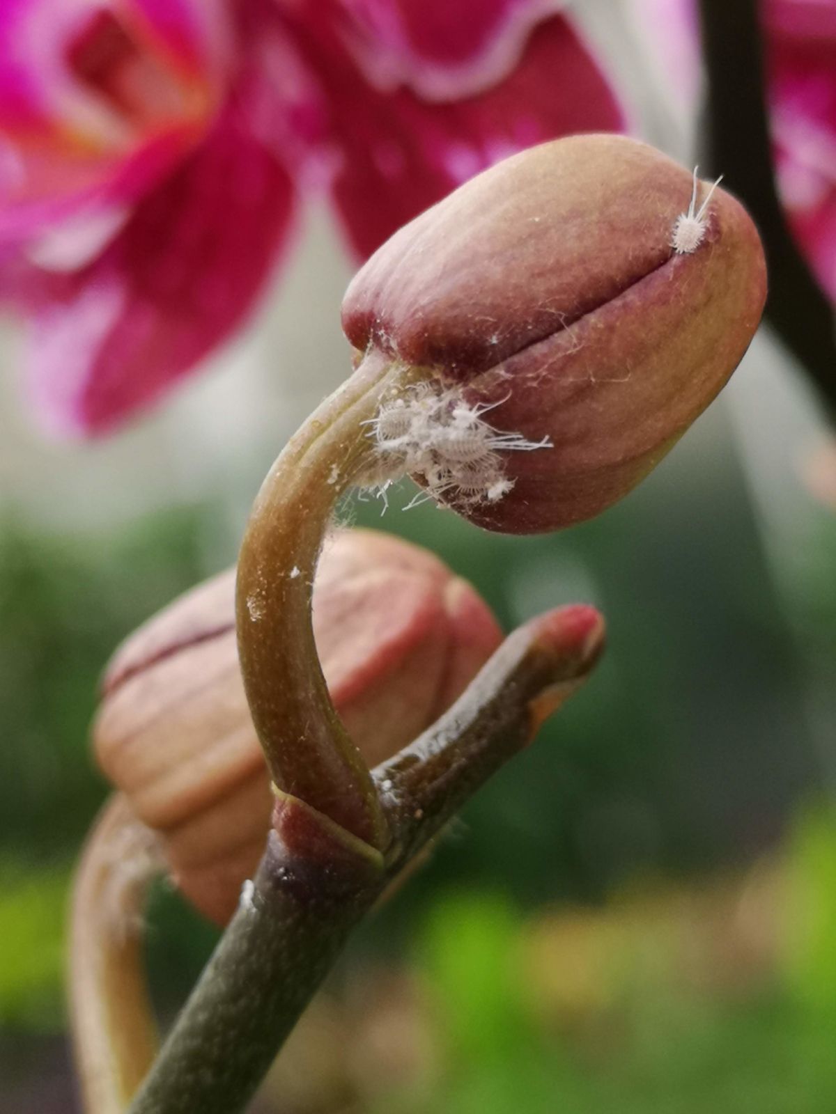 Če ste opazili, da ima vaša orhideja na listih, steblih ali celo cvetovih lepljivo snov, ki se blešči kot sladkorni sirup ali celo spominja na plesnivo prevleko, potem rastlina po vsej verjetnosti kliče na pomoč. Takšni znaki so značilni za napad vatastih uši ali kaparjev – drobnih škodljivcev, ki se hranijo s sokovi rastline in pri tem izločajo medeno roso.