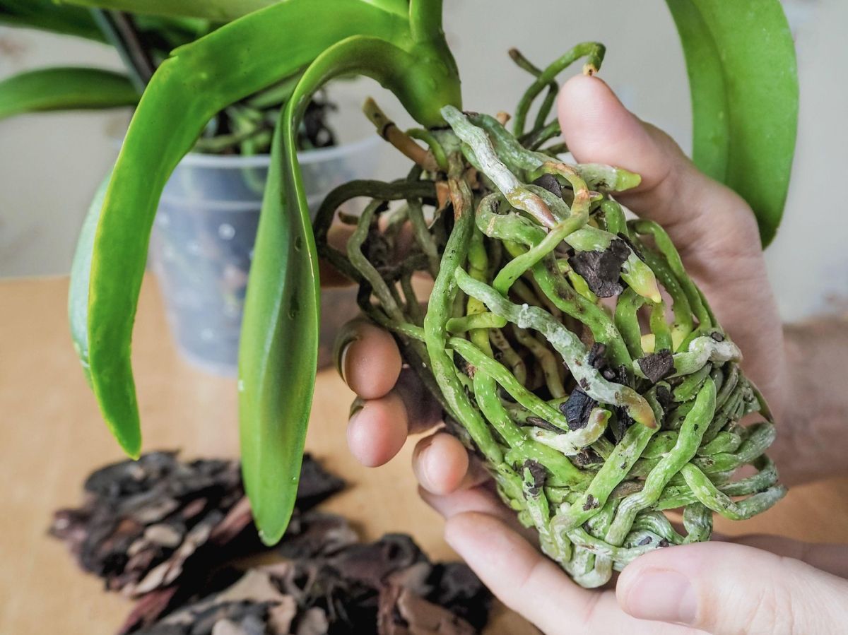 V tem primeru je nujno, da orhidejo iz lončka dvignemo, odstranimo gnile, rjave in mehke korenine ter jo presadimo v svež, zračen substrat za orhideje. Cvetno steblo z obolelimi popki odrežemo do prvega zdravega očesa ali povsem pri osnovi, da rastlina usmeri moč v okrevanje.