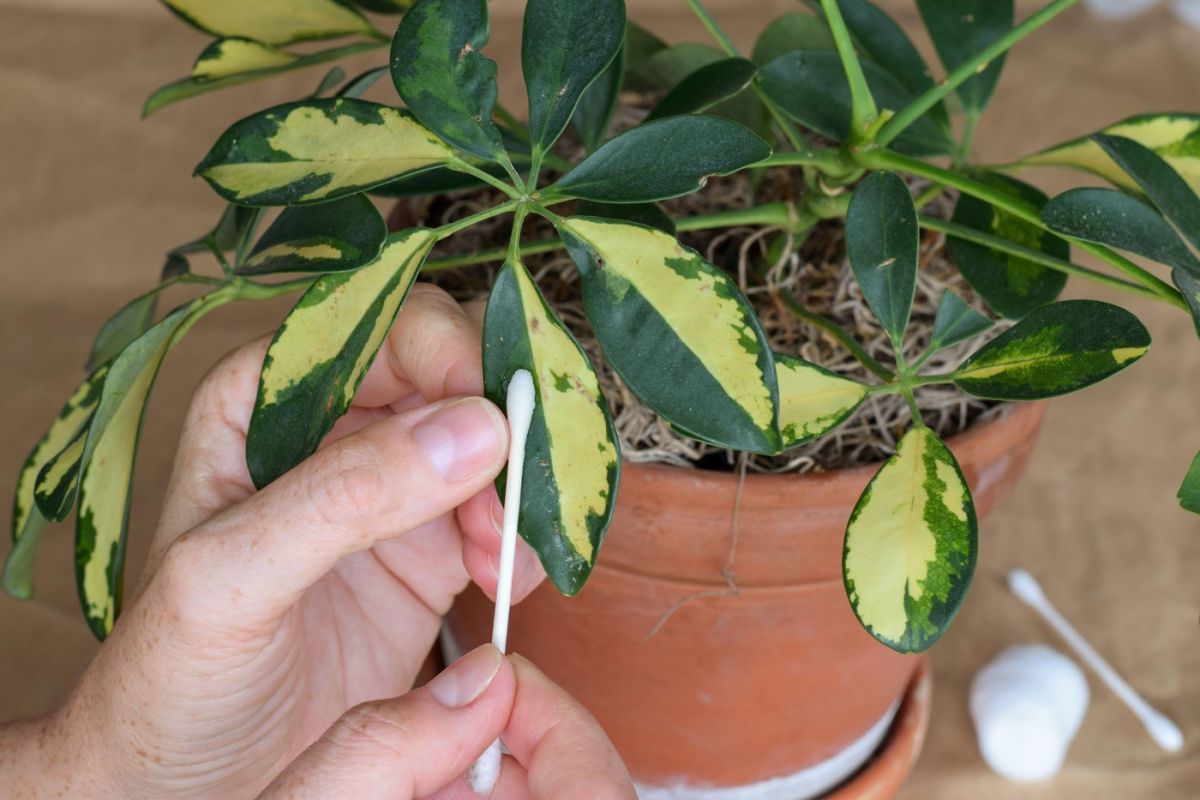 Listi, ki so bili izpostavljeni zunanjim vplivom, lahko skrivajo škodljivce. Rastline zato nežno poškropimo z mlačno vodo ali uporabimo blago naravno sredstvo, kot je razredčeno neem olje ali milnica. To prepreči, da bi škodljivce prenesli v notranje prostore.