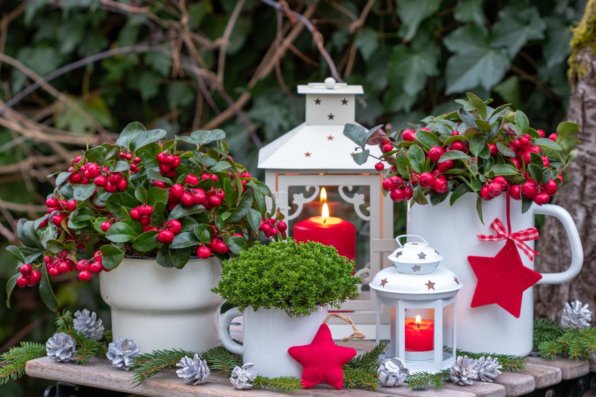 Če imamo na vrtu majhno mizico ali klop, je to idealno stojalo, na katerega lahko postavimo izbran praznični aranžma. Aranžma lahko sestavimo iz različnih predmetov, ki simbolno predstavljajo praznike – lahko je to manjši svečnik, ob katerega postavimo košaro, napolnjeno z orehi in jabolki, ali pa ob nekaj lantern različnih velikosti postavimo okrasni lonček, izklesan iz lesenega debla, v katerem raste miniaturni grmiček gaulterije z lepimi rdečimi plodovi.