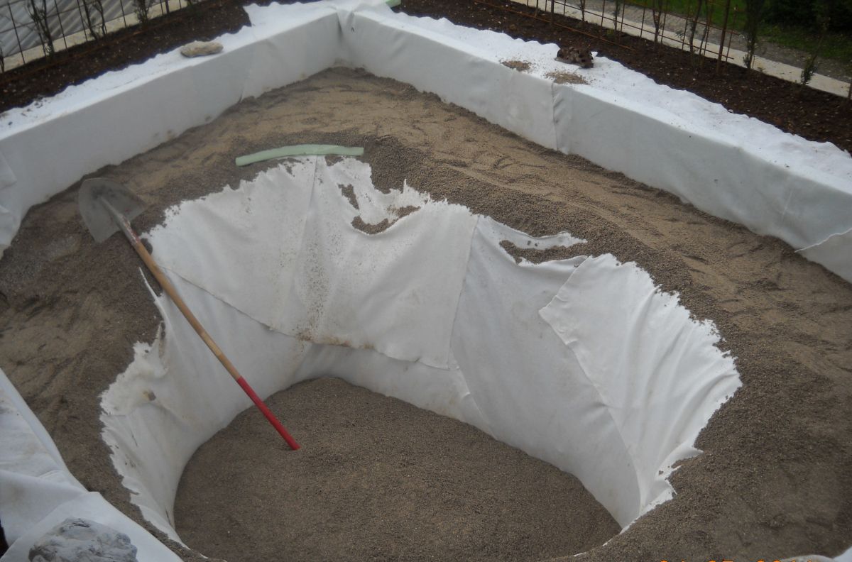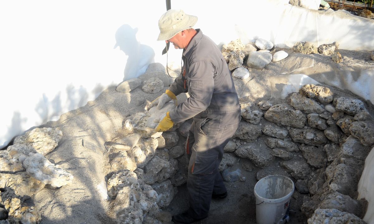 Geomembrano pred vgradnjo dobro pregledamo, saj voda ne odpušča nobene napake, pušča pa rada. Preden jo oblečemo v gornje »gate« iz geotekstila in obložimo z mineralnimi oblogami, je pametno opraviti tesnilni preskus z vodo. »Gate« in plastiko vedno zakrijemo z naravnimi materiali. Kamne zlagamo po načelih gradnje suhega zida, popolnoma brez vezave z betonom, malto ali drugimi materiali.