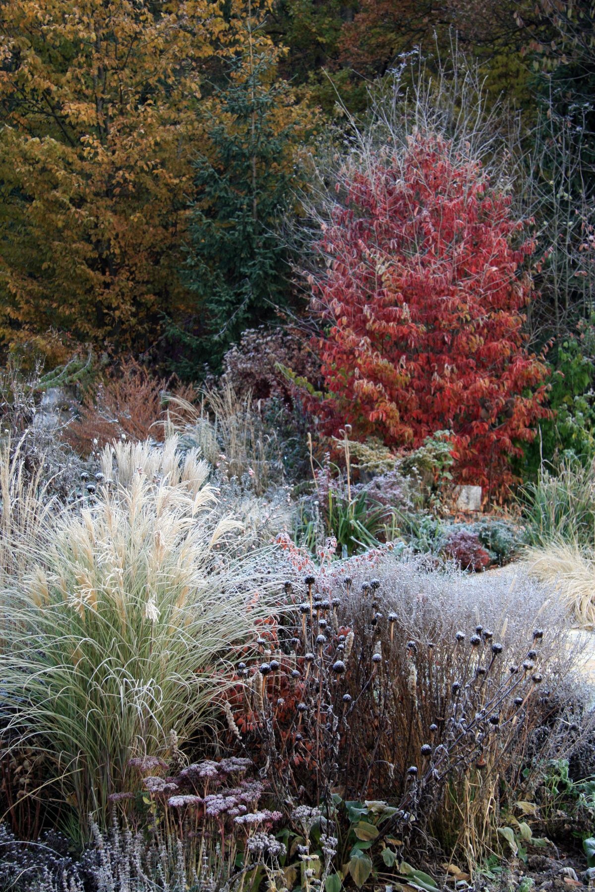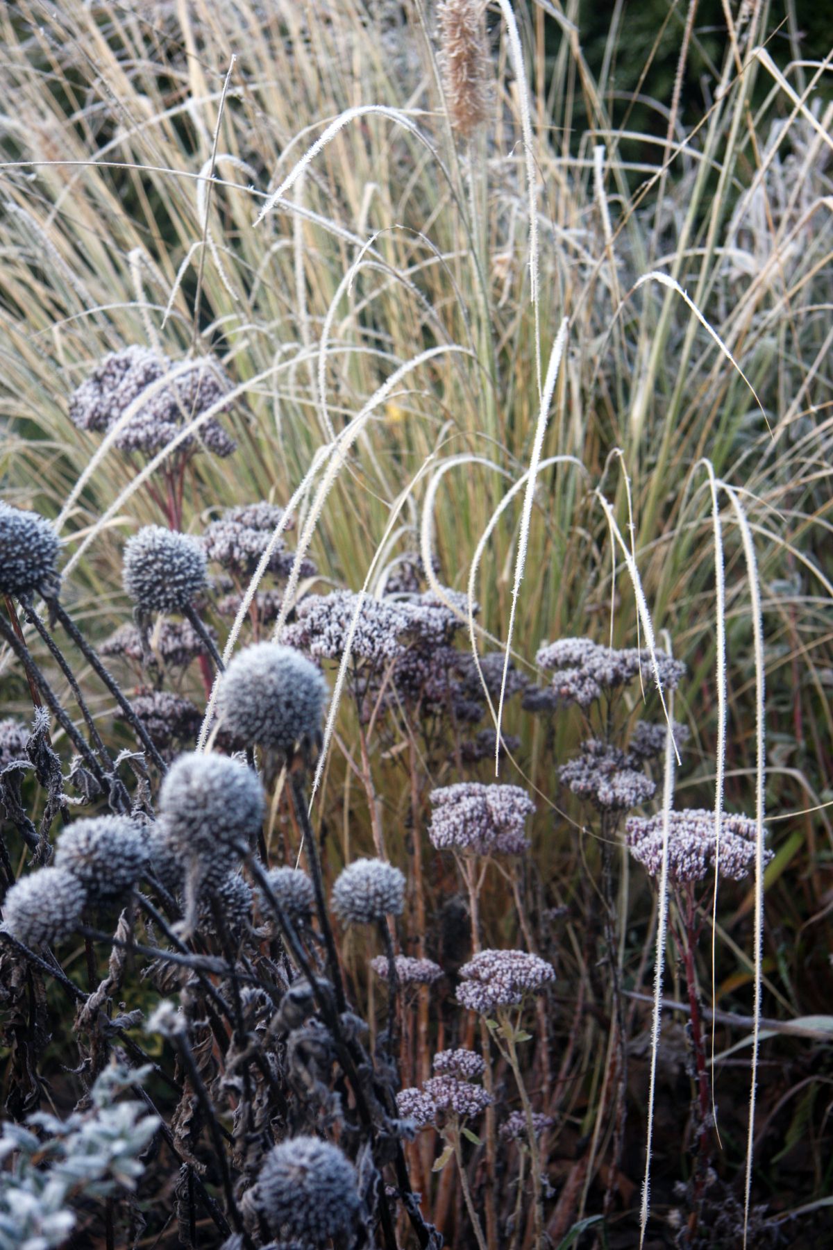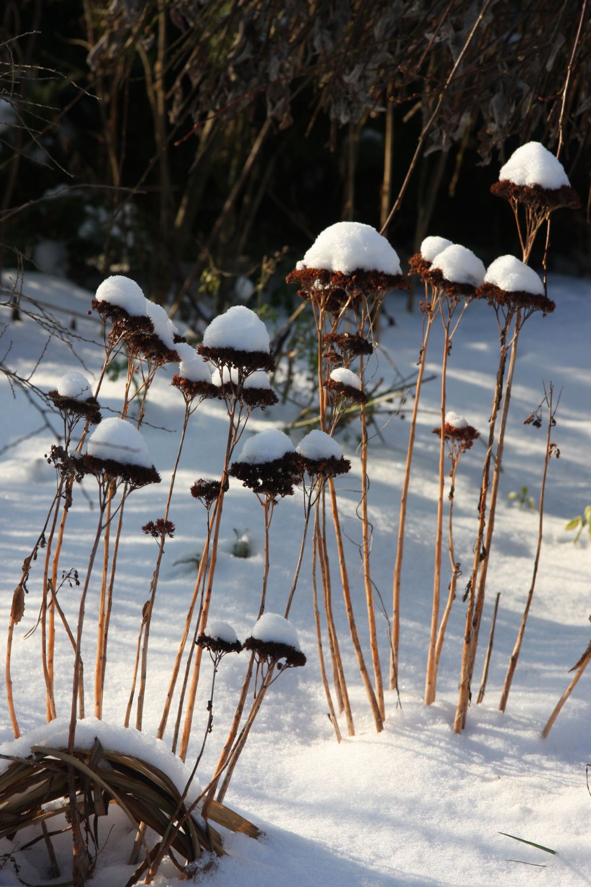 Ne pozabimo tudi na to, da imajo rastline lahko zanimive silhuete, ki, kadar jih ujamejo zaledeneli kristalčki ali odejica iz snega, postanejo že skoraj magične. Take so vse rastline z velikimi ali privlačnimi semenskimi glavami, okrasne trave, sedumi … Ko tako pride jesen, teh rastlin nikar ne porežimo do tal, pač pa jih pustimo, da se pozimi prelevijo v speče Sneguljčice sredi naših gredic. Pomembno je tudi, da jih namenoma sadimo v vrtu, seveda z mislijo, kakšen vizualni učinek bodo začarale v zimskih mesecih.