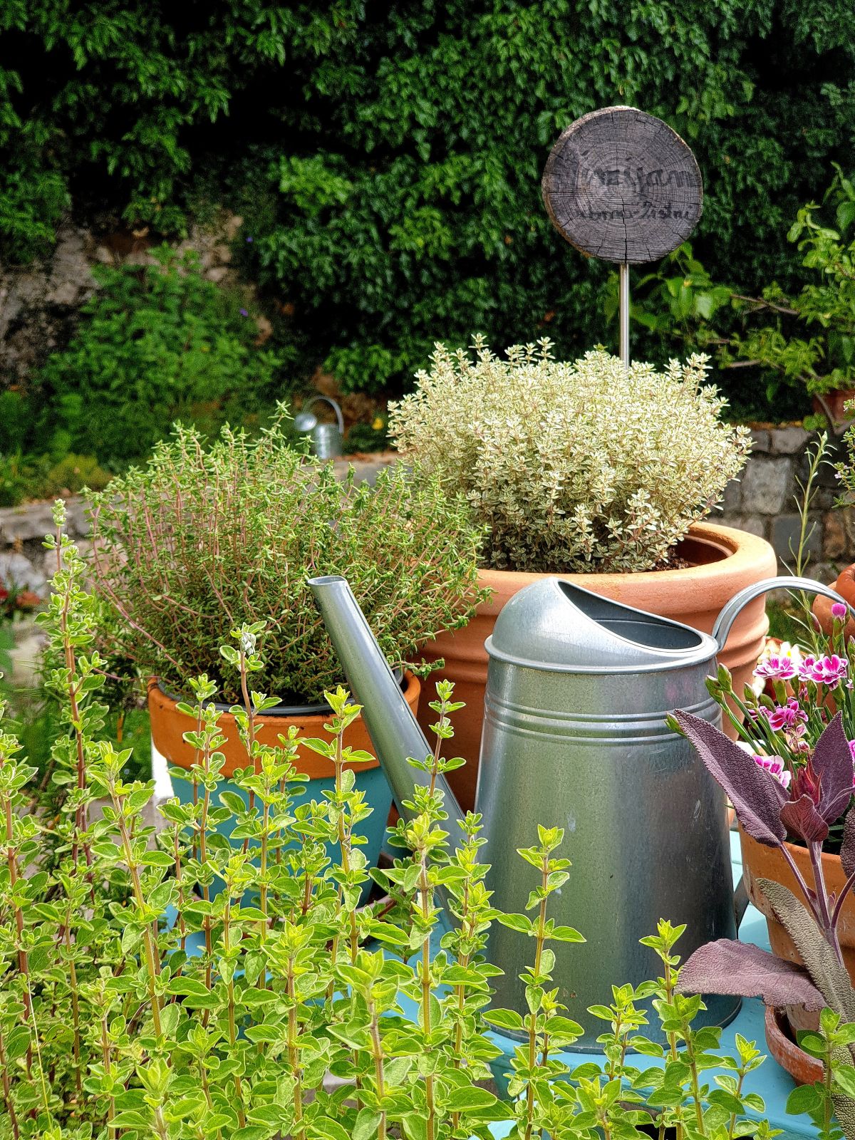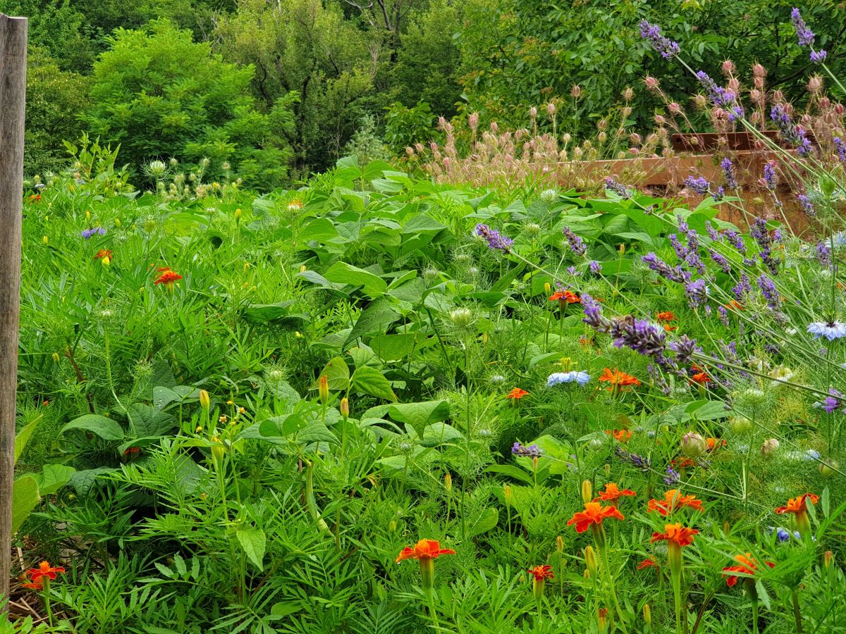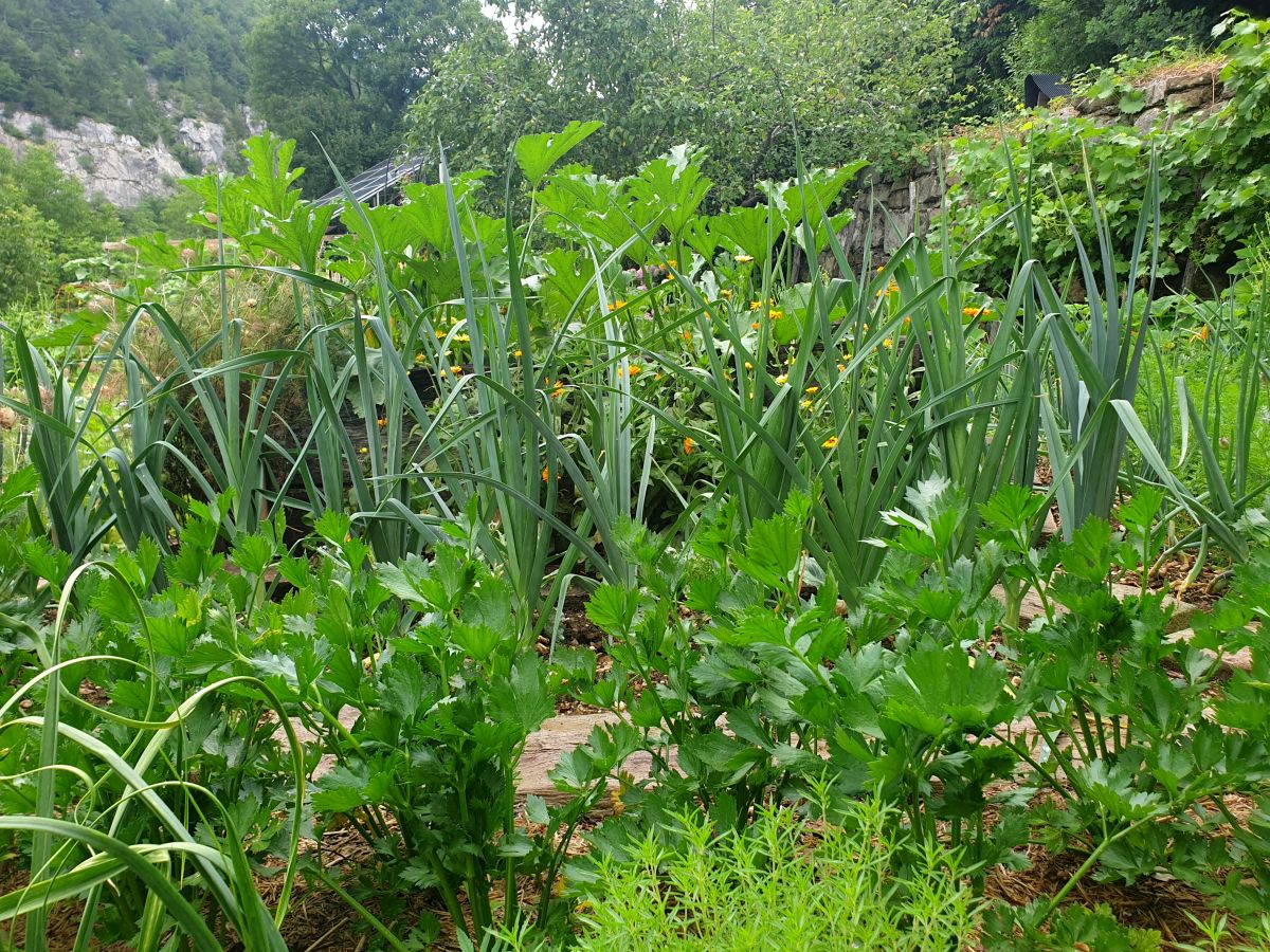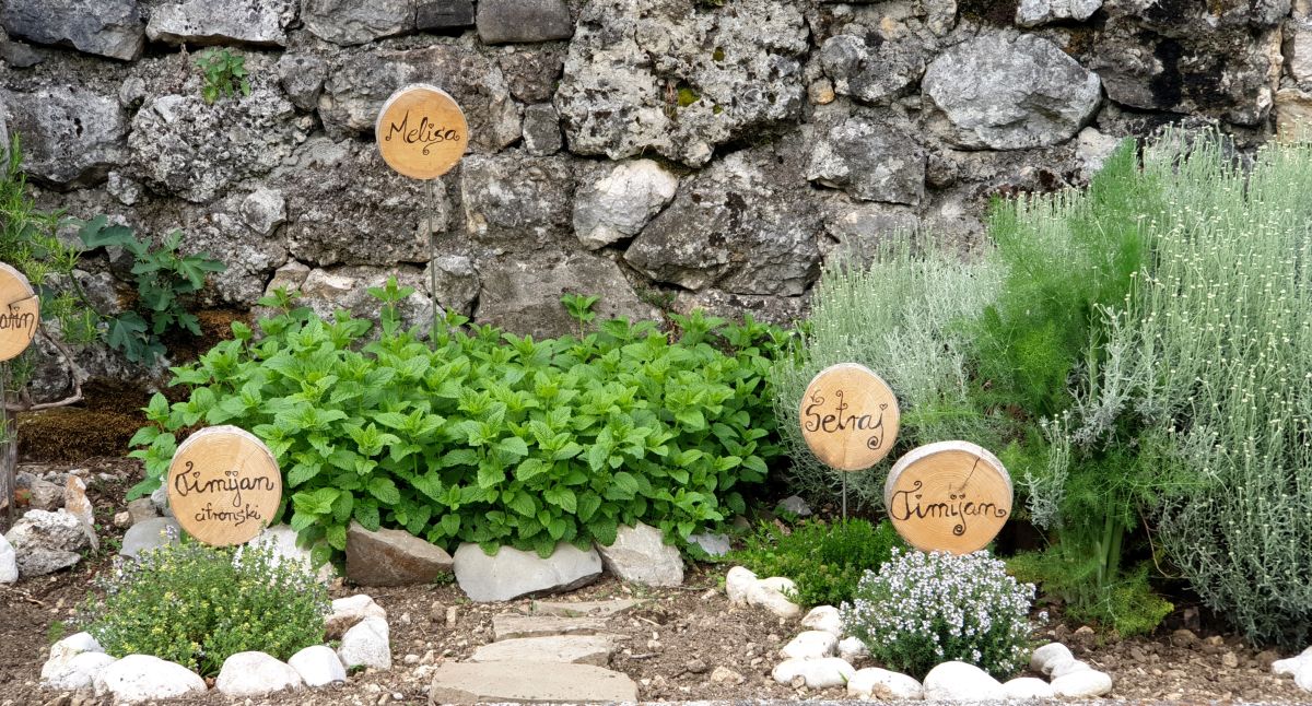Vrt ne more biti brez zelišč, zato je Ingrid izbrala prostor za zeliščni kotiček pod skalnim robom, ki še dodatno ogreva toploljube rastline. A zelišča se razraščajo tudi na zelenjavnih gredicah in pomagajo ustvarjati varno ter spodbudno okolje vrtninam, hkrati pa lepšajo videz gredic.