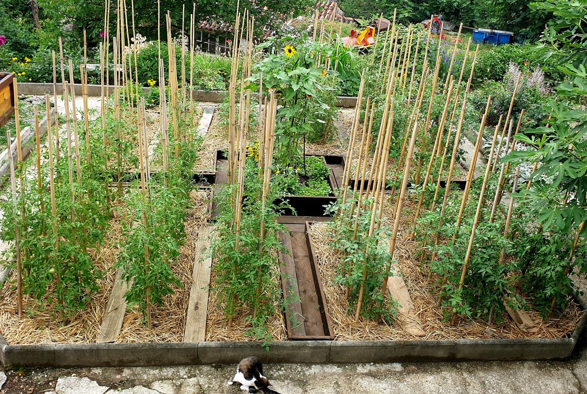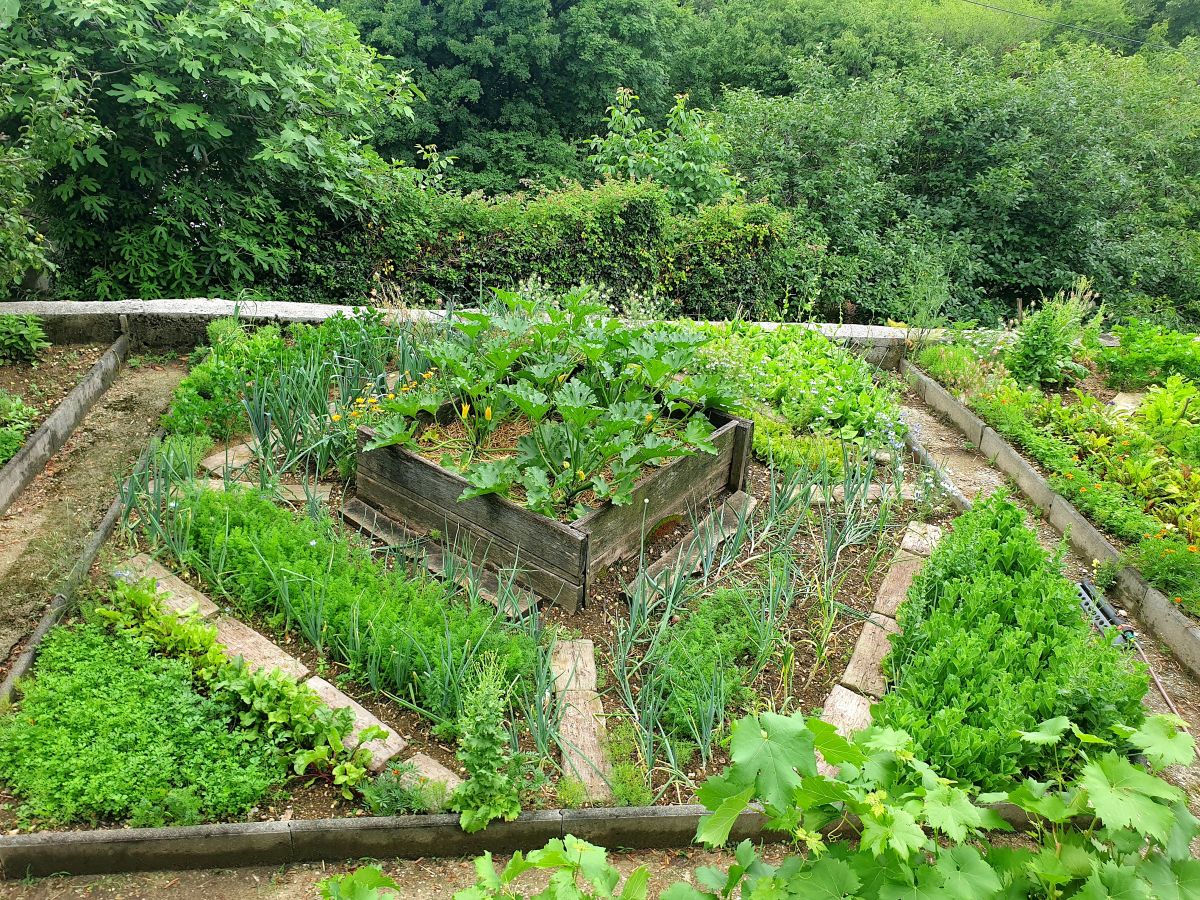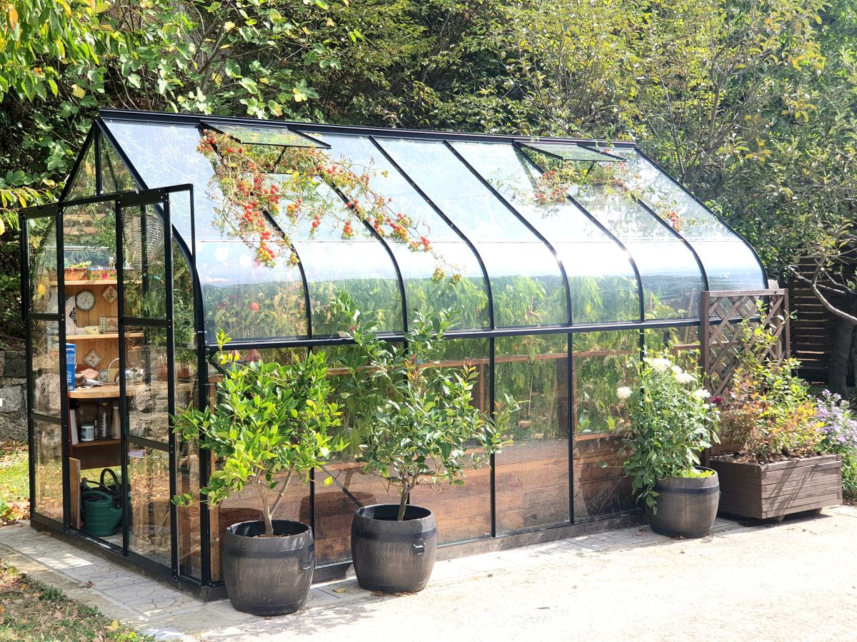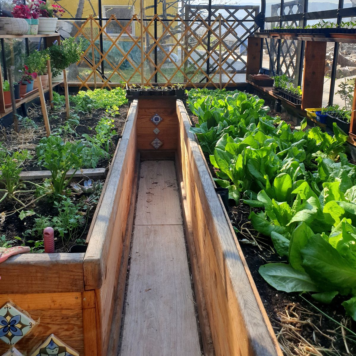 Večina gred je dvignjenih in razporejenih po določenem načrtu, dopolnjuje jih ljubek steklenjak. Da ga burja ne bi odnesla, so ga trdno zasidrali. Omogoča zgodnjo vzgojo sadik in podaljšuje čas oskrbe z domačimi vrtninami. Ingrad pravi, da so zadnje paradižnike nabrali letos februarja. Ob steklenjaku stoji delovna miza, kjer Ingrid presaja sadike, vzgaja potaknjence in oskrbuje rastline, ki potrebujejo posebno nego, zato temu kotičku pravi kar sanatorij.