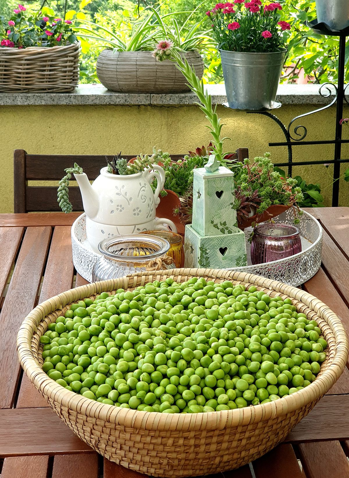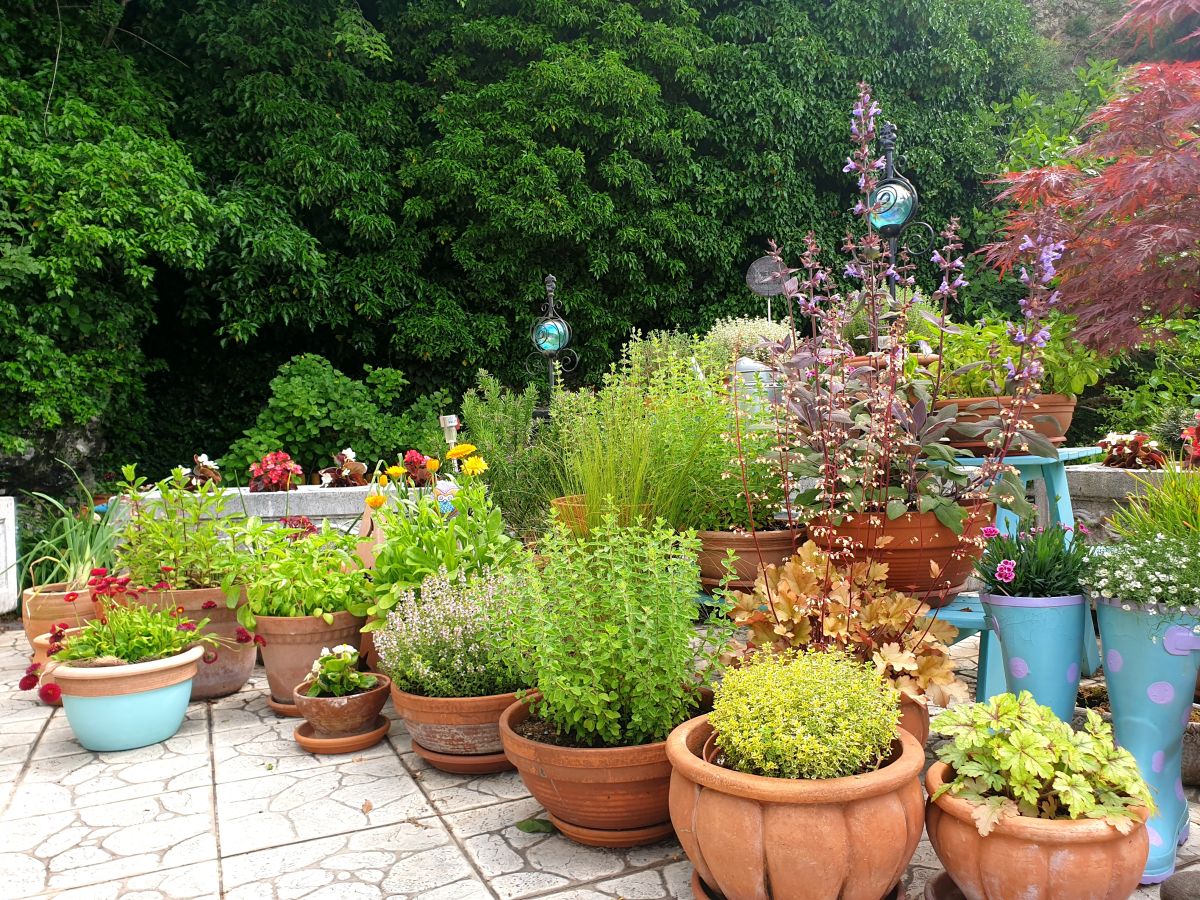 Terasa ob hiši, ki je podaljšek dnevnega prostora, je tako polna loncev in posod, v katerih se razraščajo okrasne rastline in zelišča, da je vse manj prostora za posedanje. Tu lahko kuharica na hitro odreže dišavnico ali zelišče, hkrati pa ji oko razvedri pisana družba cvetov. Brez cvetja Ingrid pač ne more, saj želi imeti v vsakem letnem času cvetlice, iz katerih sestavlja šopke. Rože na gredicah privabljajo tudi množico žuželk, ki so prav tako dobrodošle.