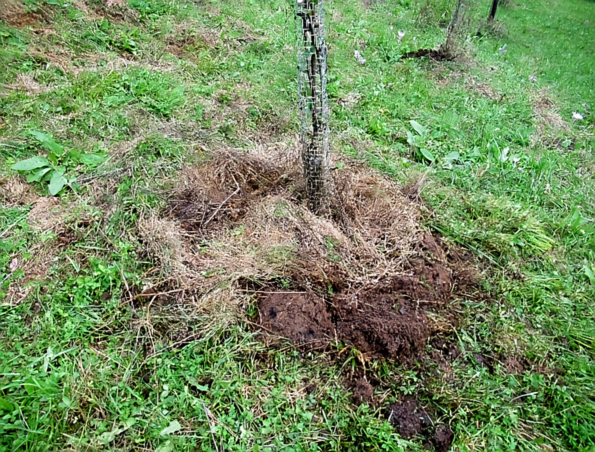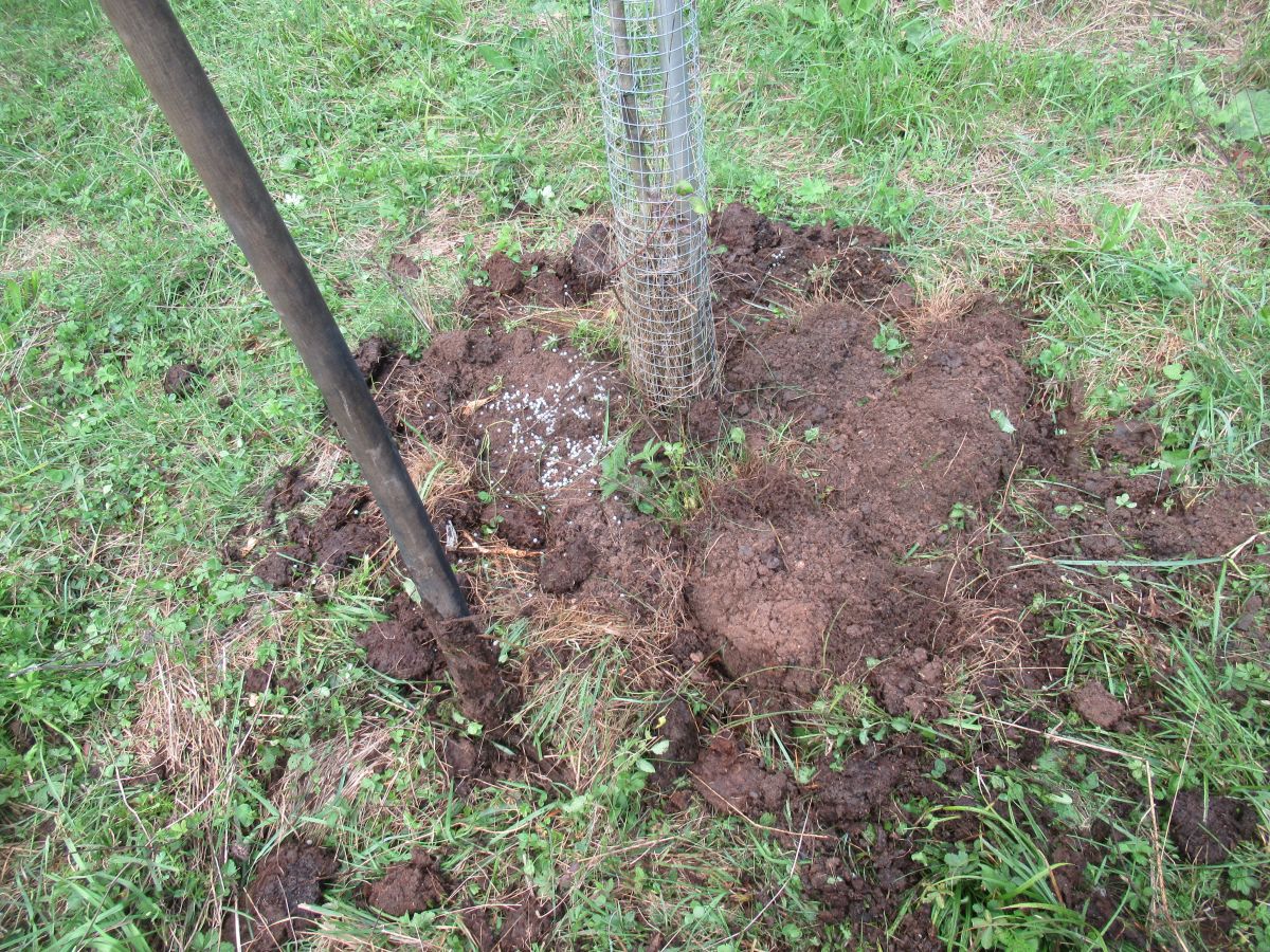 Kompost ali gnoj vedno raztrosimo po kolobarju pod zunanjim robom krošnje, kjer so korenine najbolj aktivne. Na travnati površini ga lahko rahlo vdelamo v zemljo z lopato ali motiko. Če gnojilo pustimo le na površini, bodo večino hranil porabile trave, zato ga je smiselno vsaj delno zamešati v tla. Okrog mlajših dreves lahko z lopato obdelamo ožji krog (približno 50–70 cm od debla), pri starejših pa širše območje.