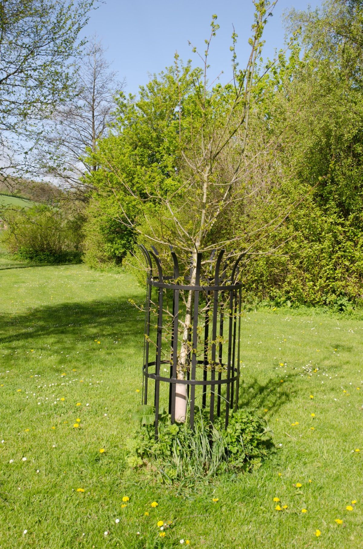Najbolj zanesljiva zaščita pred divjadjo je kakovostna mreža. Idealna je pocinkana »rabitz« mreža z okenci širokimi okoli en centimeter. Ko jo odrežemo na višino med dvema in 2,3 metra, jo lahko razpolovimo na približno 30 do 35 centimetrov široke kose in jih na tleh povaljamo okoli cevi, da dobimo tulec premera okoli deset centimetrov. Tako nastane preprosta, a trpežna zaščita, ki jo ovijemo okoli sadike in opore ter spnemo skupaj. Tak tulec je poceni, vzdrži več let in omogoča enostavno košnjo okoli drevesa. Slabost je le ta, da se enojna opora sčasoma nagne, zato jo je treba vsake toliko poravnati.