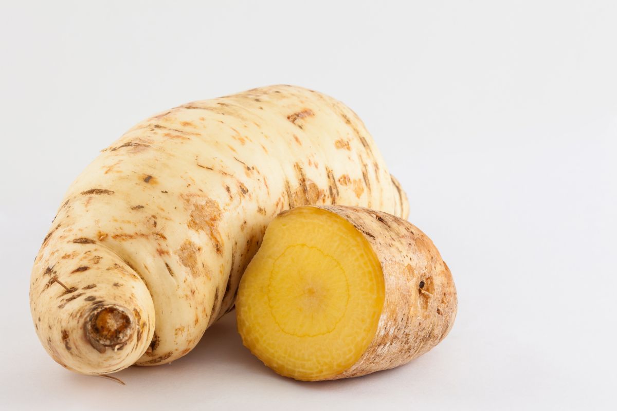 Velik, mesnat koreninski gomolj vsebuje veliko lahko prebavljivega škroba z zelo fino strukturo, zato je primeren tudi za občutljive prebave in otroško prehrano. Korenine kuhajo, pečejo, pražijo ali predelujejo v čips in nežne pireje, iz katerih pripravljajo tudi sladice. Užitni so tudi aromatični, pastinaku podobni listi in hrustljava stebla, ki jih lahko dodamo juham ali solatam.