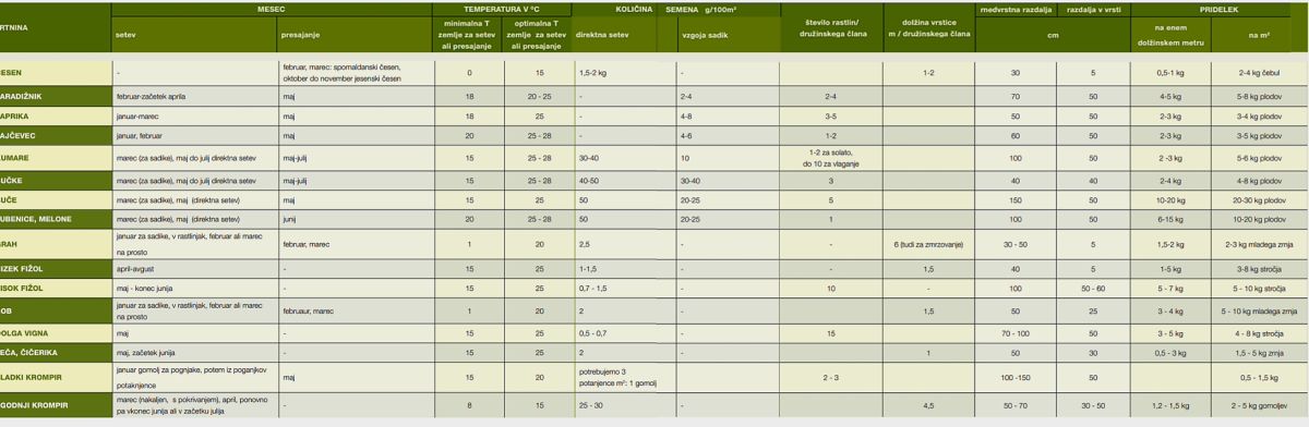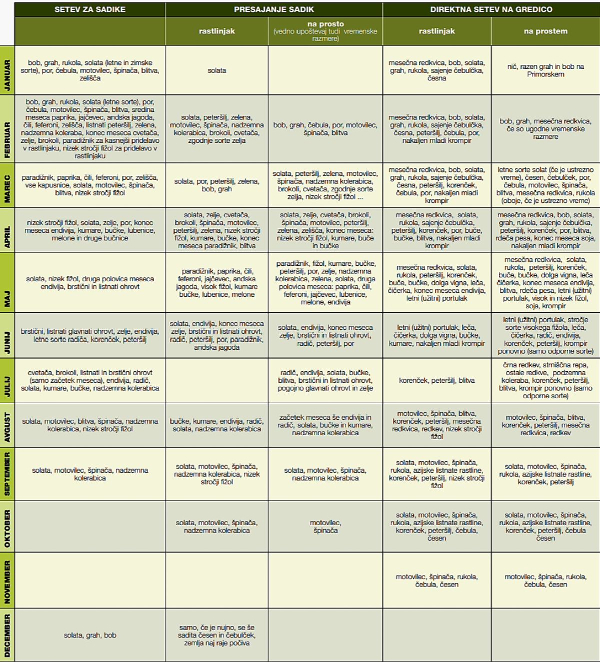 Za pomoč, kdaj kaj sejemo, sadimo in presajamo, naj vam bo naslednja tabela. Ob tem vseeno opozarjam, da so to samo predlogi. Vsako leto se moramo namreč s setvami in presajanji vedno prilagoditi posebnim razmeram, ki jih tisto leto določa vreme.