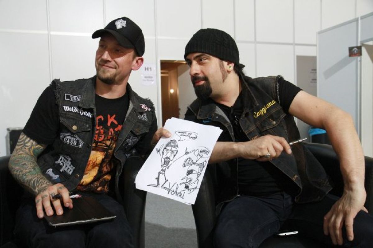 Ko se naš pogovor prevesi v zaključno fazo, se tudi vzdušje še bolj sprosti. Ko Poulsen stopi po kozarec vode, Rob šepetaje reče, naj Michaela nahecam, da ju nariše. »Ker dobro riše in to rad počne.« Ko mu predlagam idejo, je začuden, od kod vem za njegovo strast, a idejo hitro pograbi in Roba nariše kot pohotneža, kar slednjega spravi v hihitanje. Torej so Volbeat še vedno po duši najstniki? Ko pevcu omenim, da je od blizu videti mlajši kot na odru, se namuzne in nato s komaj zadržano resnostjo doda: »Sem tik pred upokojitvijo, torej hvala za kompliment.« Zanima nas, kako se bodo znašli med težaškimi bendi letošnjega Metalcampa, na katerem so, mimogrede, pred leti nastopili kot popolni anonimneži v zgodnjih popoldanskih urah.