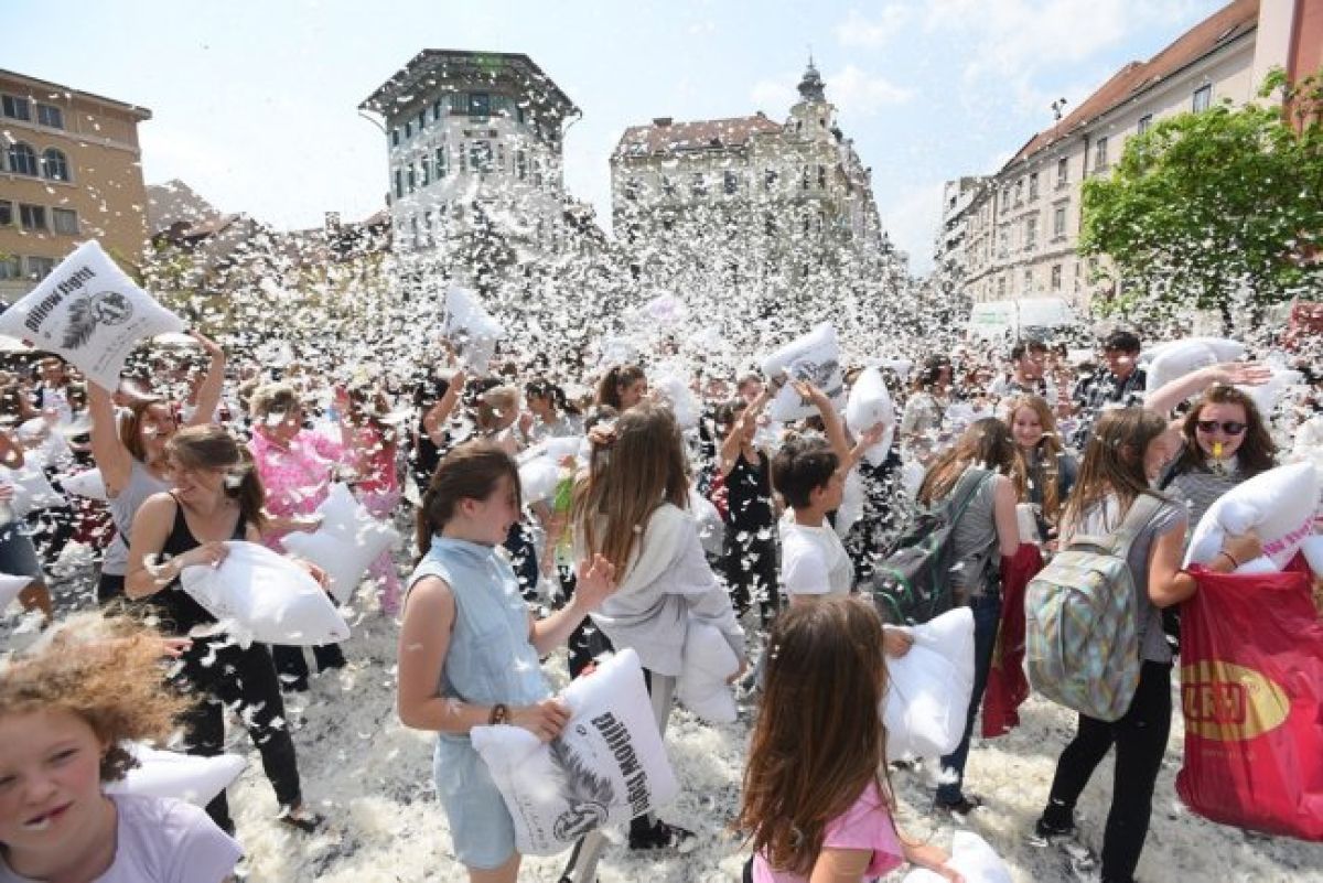 V četrtek, 14. maja, je Prešernov trg pobelilo. Ljubljano je prekrilo belo perje in tako se je mesto pridružilo najbolj trendovskim svetovnim prestolnicam, ki praznujejo mednarodno priznani »Pillow Fight«. Berlin, London, New York ... Bitka z blazinami je bila za vse prava priložnost za sprostitev, dobro voljo in sproščanje stresa ter je potekala po strogih pravilih, pri čemer je bilo »brcanje, grizenje, boksanje« prepovedano. Bitka pa je imela tudi dober namen, saj so sodelujoči na dogodku ob pomoči prostovoljcev organizacije Food For Life zbirali denar za Nepal, ki ga je nedavno prizadel še en močan potres.