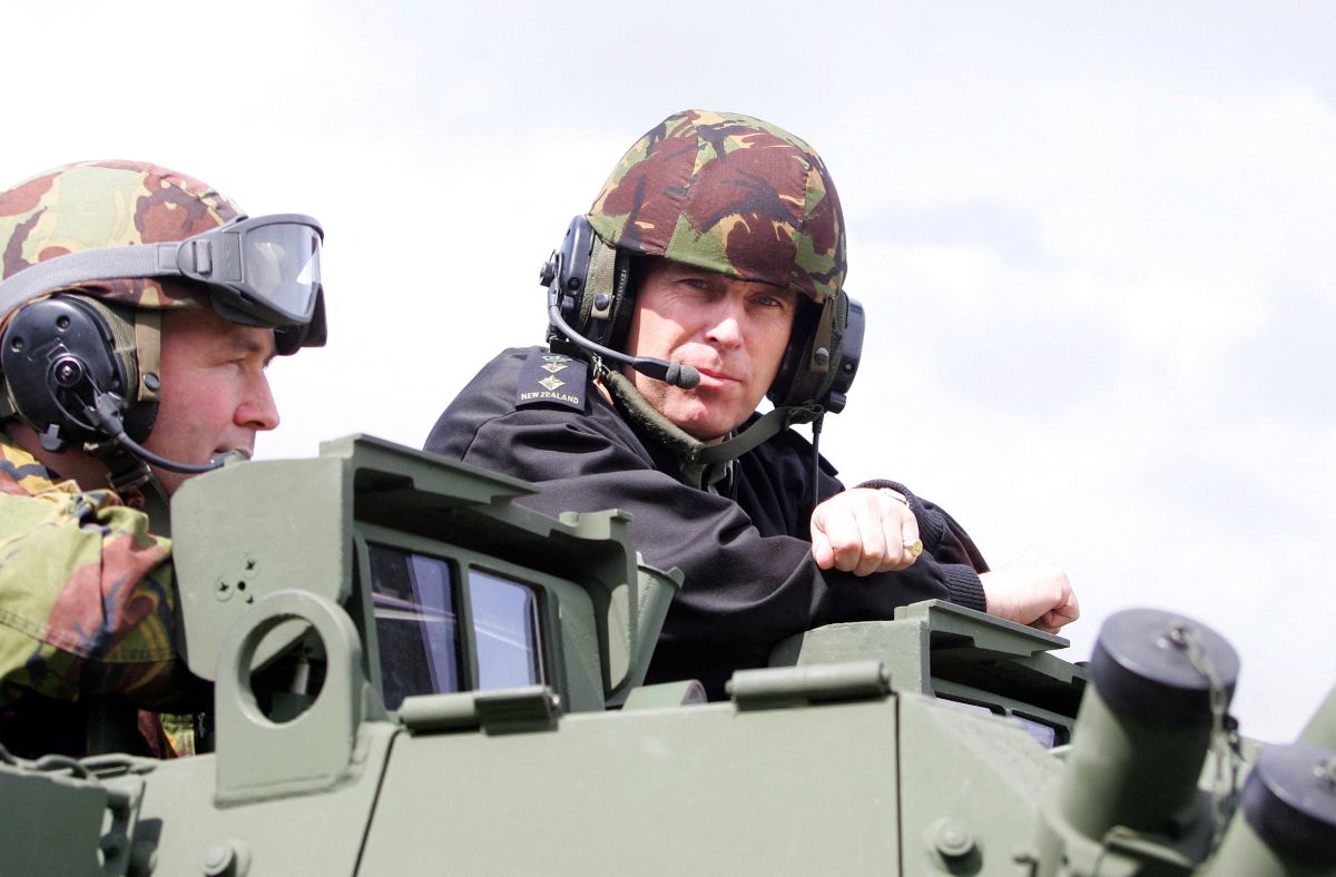 30. september 2005, Wellington: **Andrew Windsor** se med obiskom vojaškega tabora Trentham pelje v lahkem oklepnem vozilu LAV III novozelandske vojske, v spremstvu stotnika Dougala Barkerja (levo).