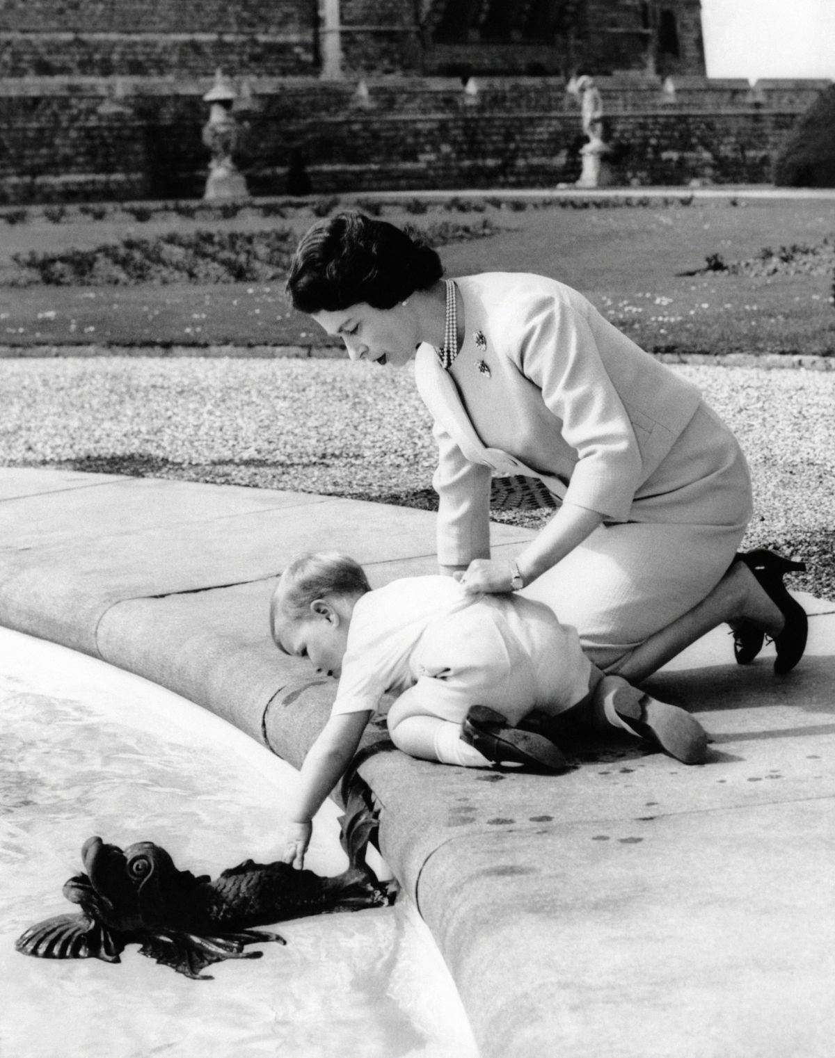 Na posestvu Windsorskega gradu: mali Andrew ob bazenu, pod budnim očesom matere