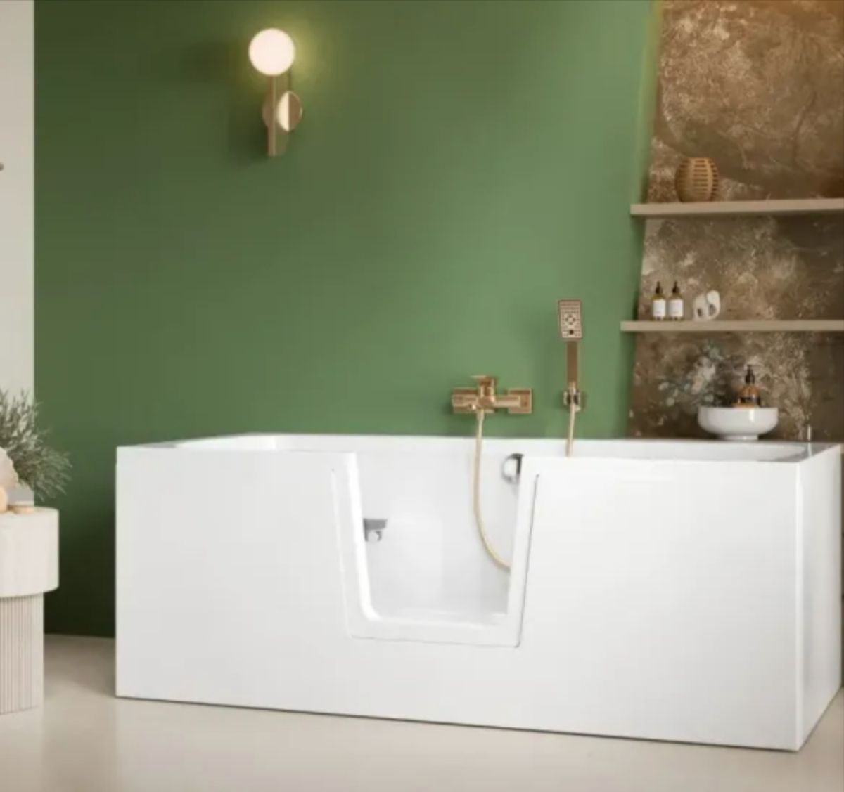 Kopalna kad za invalide ima znižan vstopni rob ali vgrajena vrata, ki omogočajo vstop brez dvigovanja nog. Za uporabnike invalidskega vozička je to ključna prilagoditev, saj omogoča prehod iz vozička v kad z minimalno pomočjo ali povsem samostojno. Ergonomsko oblikovan notranji prostor zagotavlja udobno sedenje z oporo za hrbet in stranicami, ki nudijo dodatno stabilnost.
