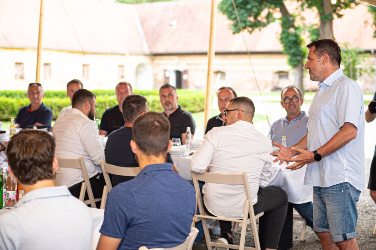 Dvotedenski oddih, ki so si ga nogometaši Mure ob koncu sezone 2021/2022 zaslužili, je končan. Že jutri bodo začeli s pripravami na novo sezono, kot uvod v začetek priprav pa so opravili tradicionalno večerjo v Dvorcu Rakičan. Tam se je poleg nogometašev kot običajno zbralo tudi vodstvo kluba, pozdravit pa sta jih prišla tudi Aleksander Jevšek in Zoran Hoblaj, ki opravlja začasno funkcijo župana Mestne občine Murska Sobota.