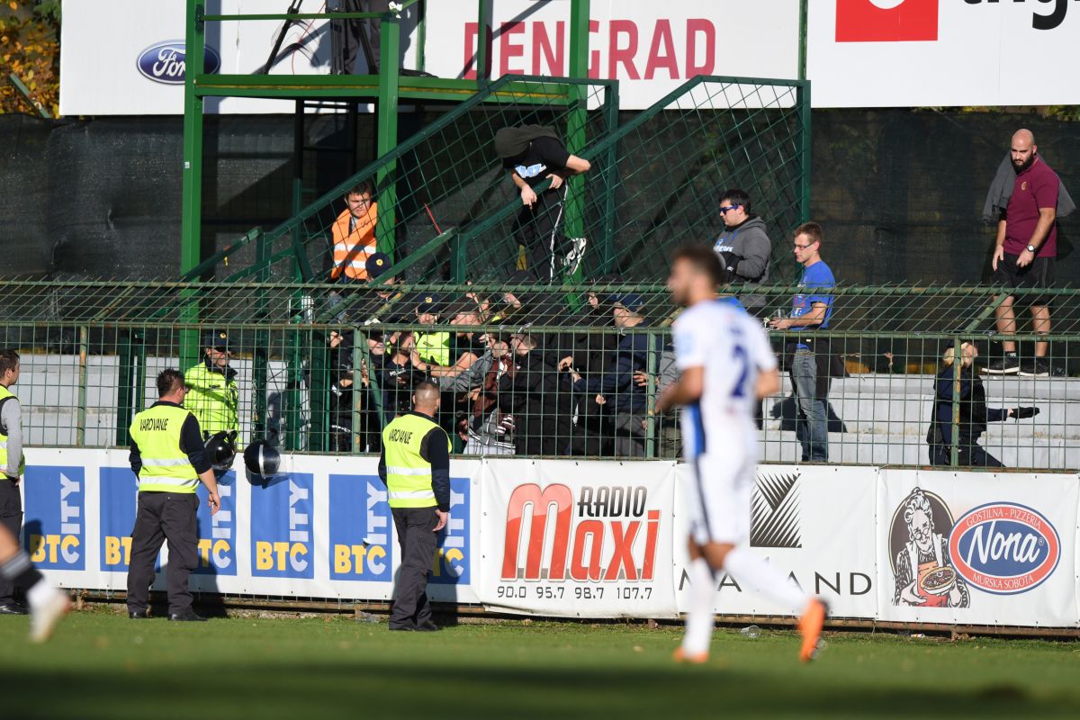 Vroče je bilo tudi na sami tekmi, saj je v polčasu eden od članov goriške navijaške skupine preplezal ograjo prostora za gostujoče navijače, ker je je želel do prostora na severni tribuni, kjer so domači navijači, a so mu to namero varnostniki preprečili. Končal je v rokah policistov.
