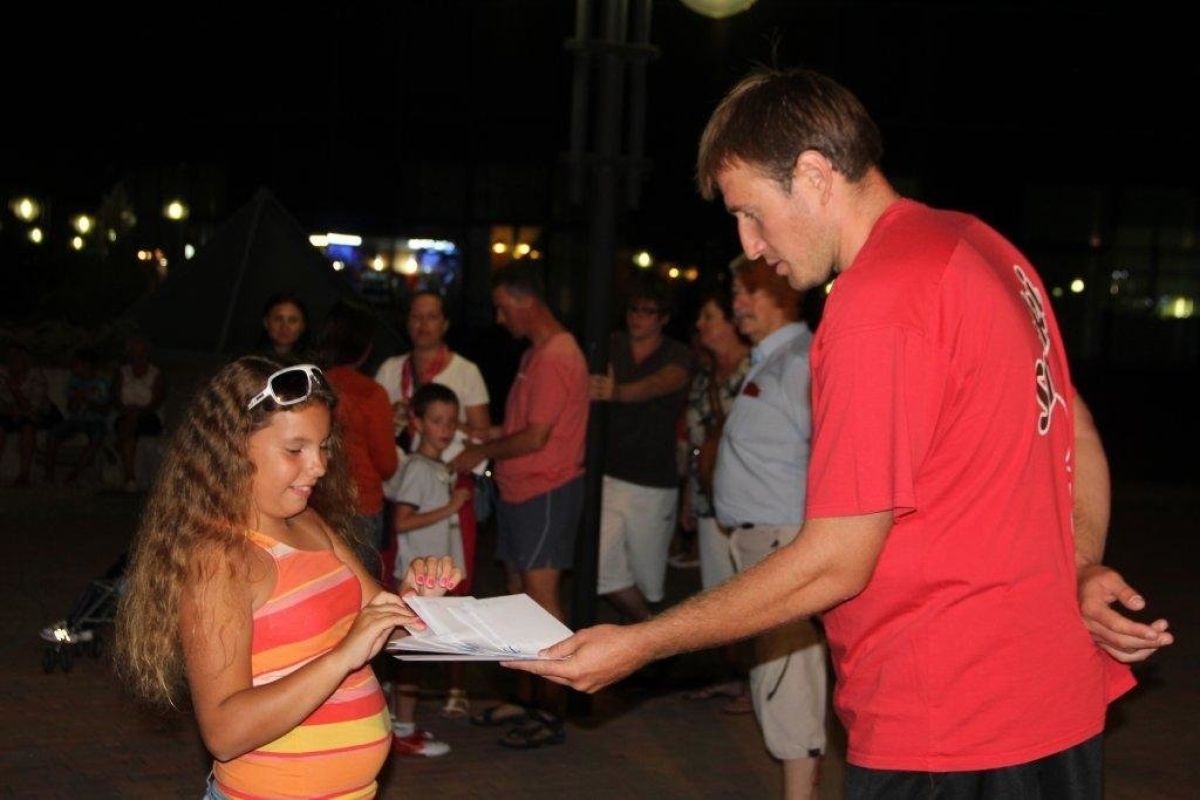 Na včerajšnji torkov poletni večer je v Termah Čatež potekalo druženje pod zvezdami in z zvezdo - košarkarjem Matjažem Smodišem. Vsi, ki so bili dovolj 'pogumni', so se lahko z njim pomerili v metanju na koš - pred okrepčevalnico Urška na Čatežu. Izziv je bil velik, odziv pa tudi ... Med publiko in tistimi, ki so se odločili premagati Matjaža, so bili manjši, večji, mlajši in starejši ...