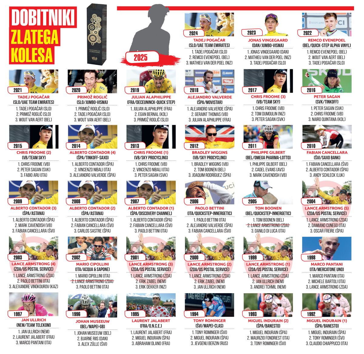 V petek zvečer bodo v Parizu podelili kolesarske oskarje, dva zlata kipca, vključno s tistim najbolj prestižnim, pa bi moral domov odnesti Tadej Pogačar. Povedano drugače, Zlato kolo, ta kolesarska različica nogometne Ballon d'Or, bi moral tretjič po letu 2021 in 2024 pristati v Pogijevi garaži.