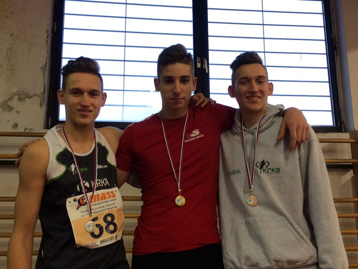 Zelo uspešno so v Ljubljani nastopili mlajši mladinci Atletskega kluba Krka, ki so osvojili kar pet medalj. Najžlahtnejši je bil Andraž Durjava, ki je osvojil srebro in s tem naslov državnega podprvaka v skoku v višino in troskoku. V višino je preskočil je 173cm in prenehal s tekmovanjem, saj sta se višina in troskok prekrivala in je moral izpustiti nadaljnje višine, če je želel nastopiti v troskoku. Kljub napornemu ritmu, mu je uspelo skočiti do novega osebnega rekorda 12.65m. Državni podprvak je postal še Joško Švirt v skoku s palico, kjer je preskočil 3.80m in s tem za 20cm popravil osebni rekord. Tretji mesti pa sta dosegla Anej Umek v teku na 60m z ovirami s časom 8.65s (osebni rekord) in Anže Durjava v troskoku (12.60m – osebni rekord).
