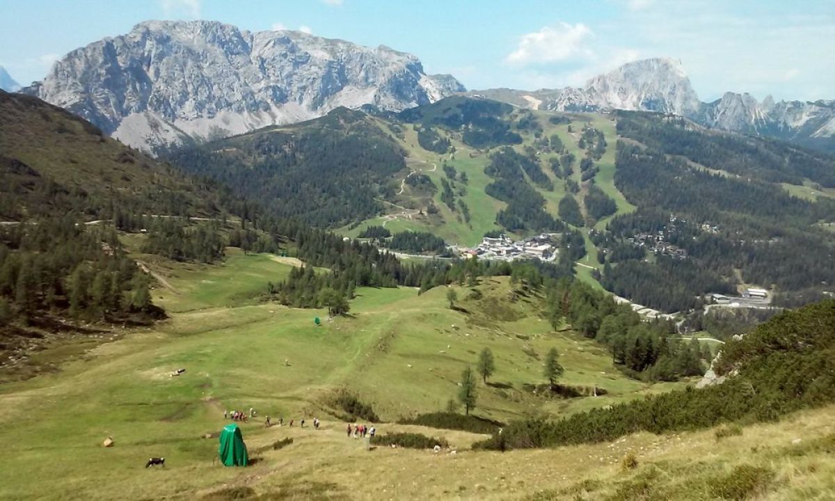 Zjutraj smo se podali na Ojstrnik/Osternig, 2052 m. Hodili smo po širnih pašnikih, travnatih pobočjih, mimo ostankov vojaške uredbe na nekoliko višji vrh z vpisno skrinjico ter na vzhodni s križem. Do planine Bistrica/Hütte Oisternig smo sestopili po vzhodnem grebenu in se od planine sprehodili do kapelice Marije Snežne/Maria Schnee. Planina je živa kot vse na naših ciljih, pase se veliko krav, konjev, ovac in koz.