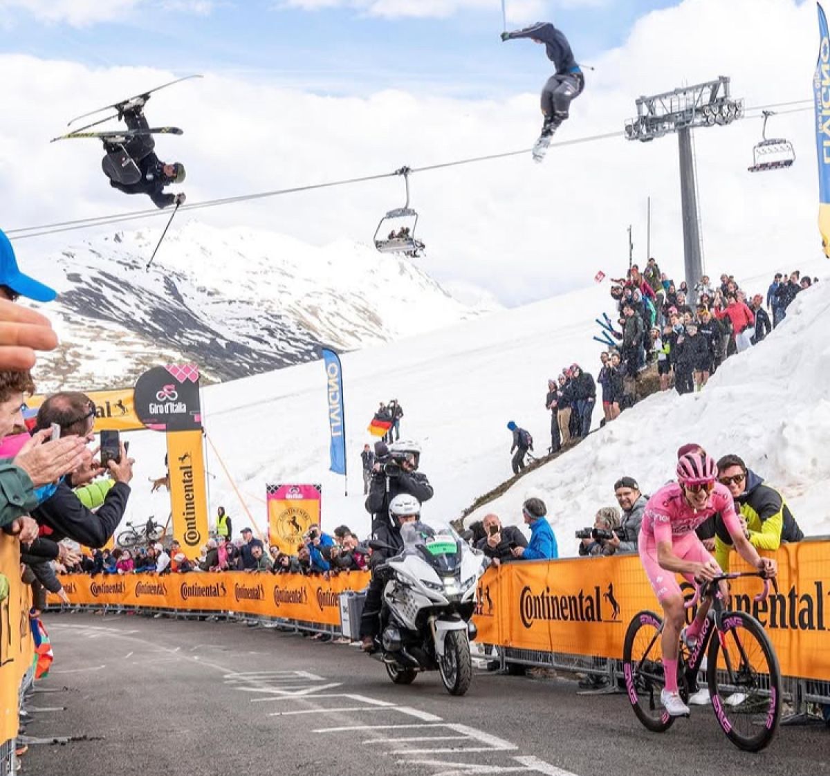 Na 15. etapi italijanskega Gira 2024, ko je Tadej Pogačar ponovno kazal svojo moč, sta čez njega poletela dva akrobatska smučarja.