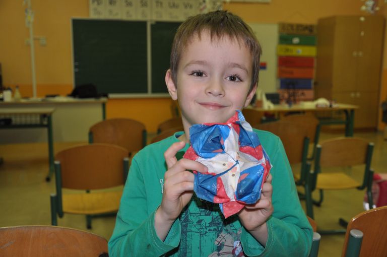V četrtek, 17. decembra, smo na Osnovni šoli Šmihel Novo mesto v podaljšanem bivanju izvedli delavnico, na kateri so se drugošolci preizkusili v različnih načinih zgibanja papirnatih prtičkov. Obiskala jih je učiteljica gospodinjstva Marjetka Dragman. S seboj so učenci prinesli raznovrstne prtičke s prazničnimi motivi. Dragmanova se je najprej z učenci pogovorila o uporabi prtičkov. Preden so se pripravili k delu, jim je dala še nekaj koristnih nasvetov: imeti morajo čiste roke, rokave morajo zavihati, s prtički morajo delati nežno, kajti lepo zložen prtiček pričara praznično mizo. Pod njenim vodstvom so se učenci naučili zgibanja prtičkov na več načinov: kot svečko, stožec, piramido, pahljačo, ladjico in lokvanj. Vsak način je Dragmanova nazorno pokazala, učenci so ga nato izdelali, marsikaj pa je zanimivega o njem tudi povedala. Ena od oblik je lokvanj, vanj lahko damo bonbon ali manjšo čokoladico, lepo misel. Ladjica je še posebej primerna, kadar jemo morske jedi oz. jo uporabimo kot simbol - da zaplujemo v novo leto. Prikazala je enostavne in bolj zahtevne načine zgibanja. Ugotovili smo, da je pri zgibanju potrebna natančnost, vztrajnost in nekaj vaje. Drugošolci so marsikaj novega zvedeli in obljubili, da bodo to upoštevali pri pripravi prazničnih pogrinjkov.