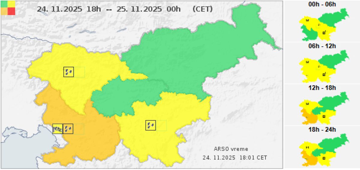 Agencija RS za okolje (Arso) je v popoldanskih urah za Primorsko izdala oranžno opozorilo. Ponoči je pričakovati obilne padavine.