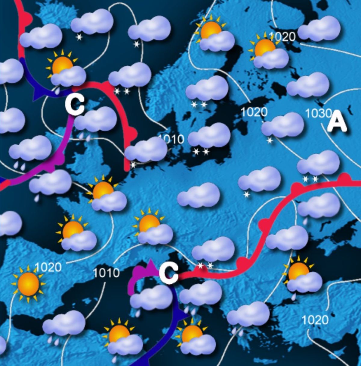 Nad Sredozemljem se zadržuje ciklonsko območje, nad srednjo Evropo pa šibko območje visokega zračnega tlaka. V višinah nad nami piha jugozahodni veter, ki prinaša vlago, potrebno za nastanek padavin, pri tleh pa piha hladen veter vzhodnih smeri. Stik različnih zračnih mas ob dovolj nizkih temperaturah je vedno dober recept za sneženje. Ponekod v osrednji in južni Sloveniji že rahlo sneži. Rahlo sneženje se bo danes in tudi v noči na torek občasno razširilo nad večji del države.