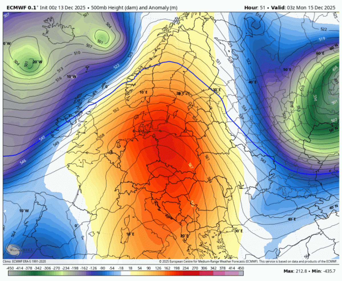 Kot so dodali, bo anticiklon nad nami verjetno oslabel šele v drugi polovici naslednjega tedna, ko se bo nova atlantska dolina s hladnejšim zrakom spustila proti Sredozemlju. "Takrat vidimo bolj meridionalni tip tega vdora, saj se bo kot kaže okrepilo območje visokega zračnega pritiska nad severnim delom Atlantika kot posledica popuščanja grebena nad Aljasko in večjo valovno aktivnost nad Atlantikom."