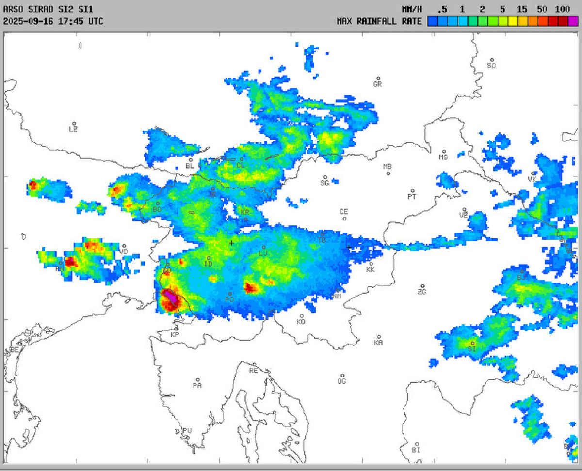 Močnejša nevihta je nastala v Italiji in se je pomaknila vzhodno od Kopra. Okoli 20.40 se pomika se proti jugovzhodu. Poleg močnega naliva so možni sunki vetra in toča. Ob tem je možno zastajanje padavinske vode in naraščanje hudourniških vodotokov, so navedli pri Arsu.