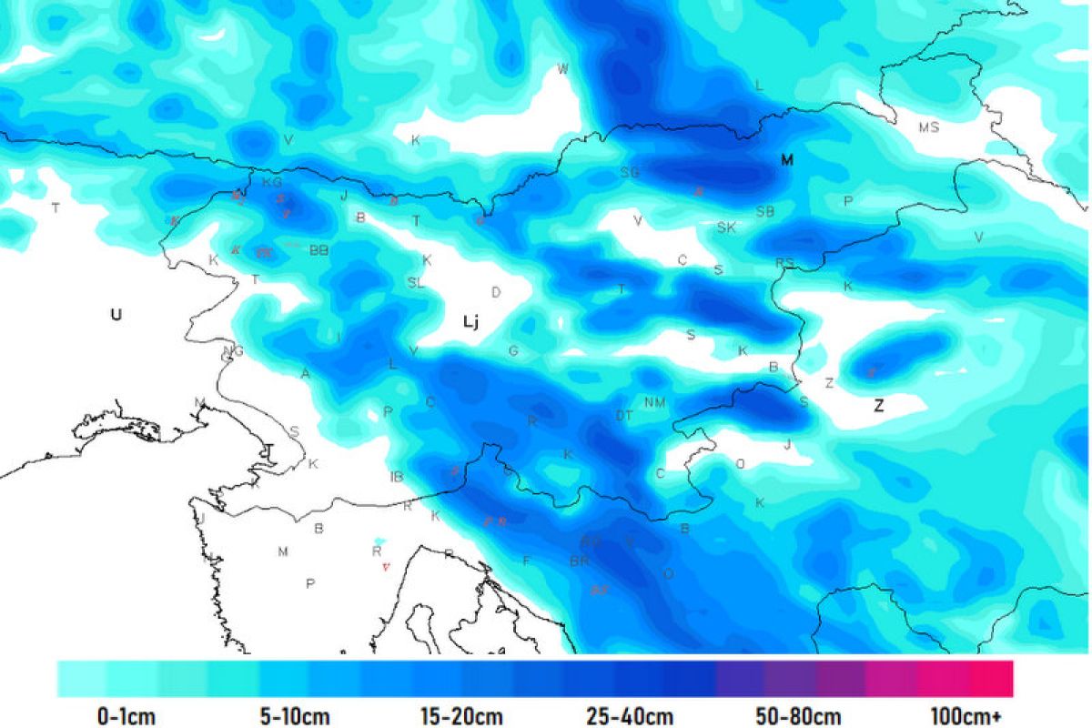 V noči na sredo se bodo padavine od vzhoda razširile nad večji del Slovenije, meja sneženja pa se bo dokaj hitro spuščala in marsikje v notranjosti Slovenije dosegla tudi nižine. Do noči na četrtek bo predvidoma največ snega zapadlo na širšem območju Pohorja, Gorjancev in Kočevskih gora. Na omenjenih območjih lahko nad nadmorsko višino 500 m pričakujemo večinoma od 10 do 20 centimetrov debelo snežno odejo, v nižje ležečih krajih pa nekaj manj, saj bo sprva še deževalo.